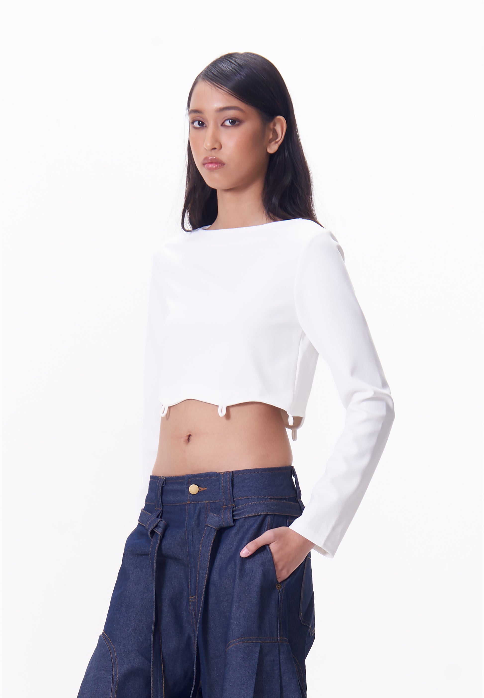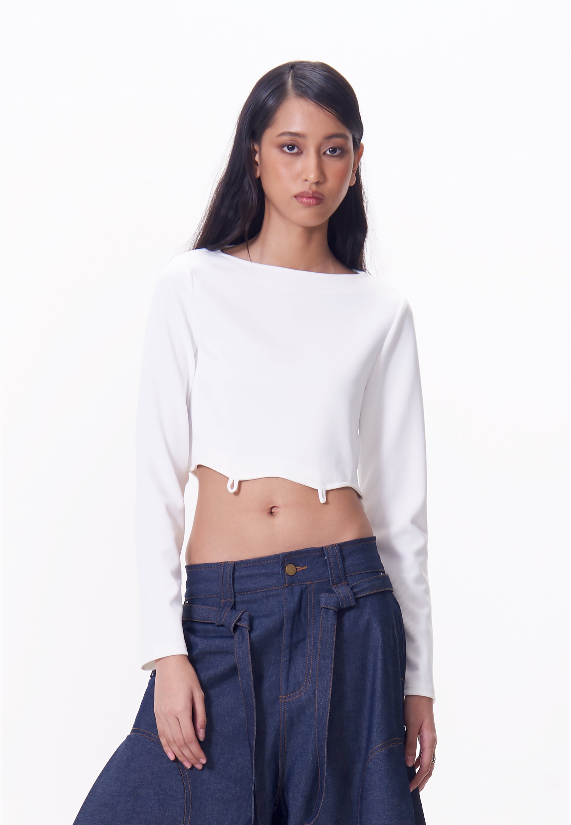 Long-sleeve top made from knit spandex, featuring a boat neckline and scalloped waist detail with a matching hem finish. Designed with a detachable hem secured with pearl buttons and loops for a versatile and chic look.