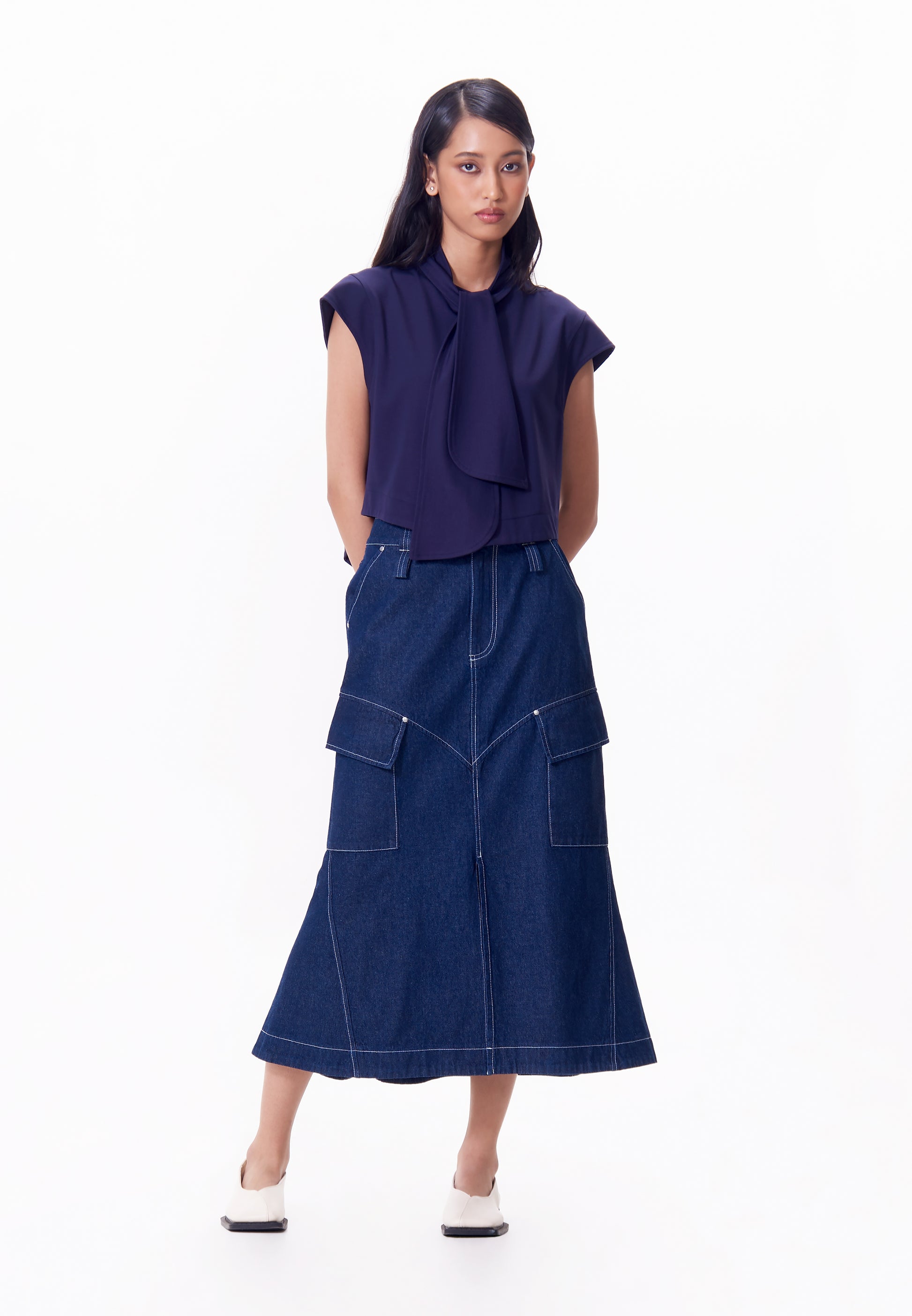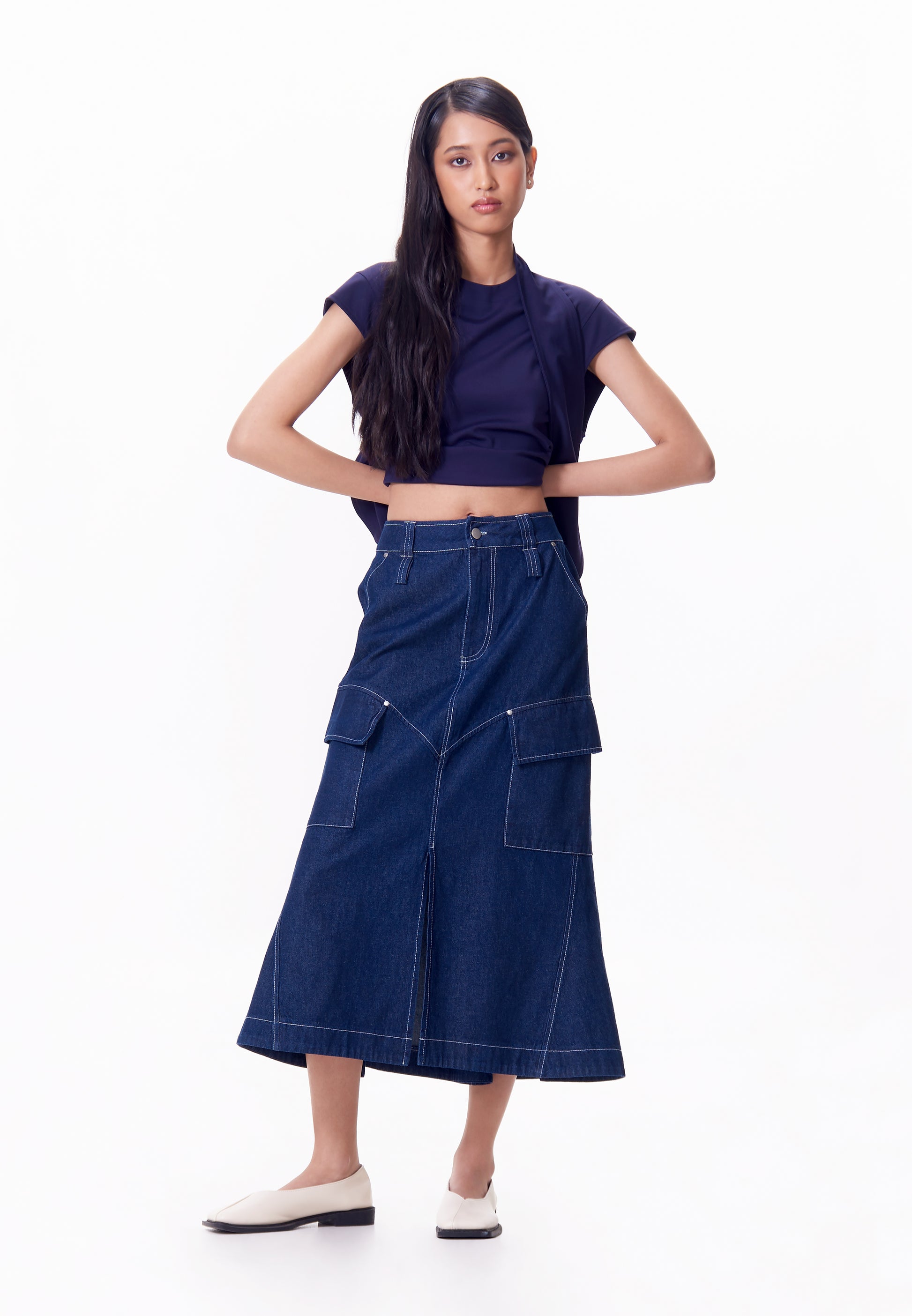 High-waisted midi-length pants made from twill fabric, featuring a semi-mermaid cut and contrast thread stitching. Designed with utility pockets on the thigh, metal rivets on all pocket ends, and finished with a Nicolo embroidery logo on the back right pocket for a functional yet stylish look.