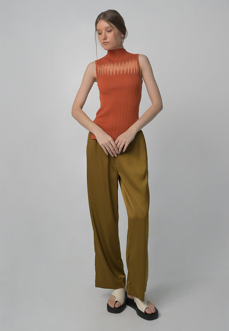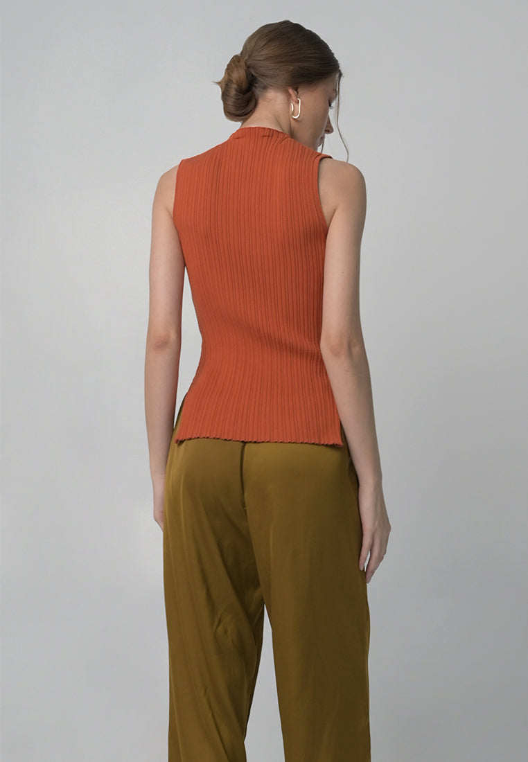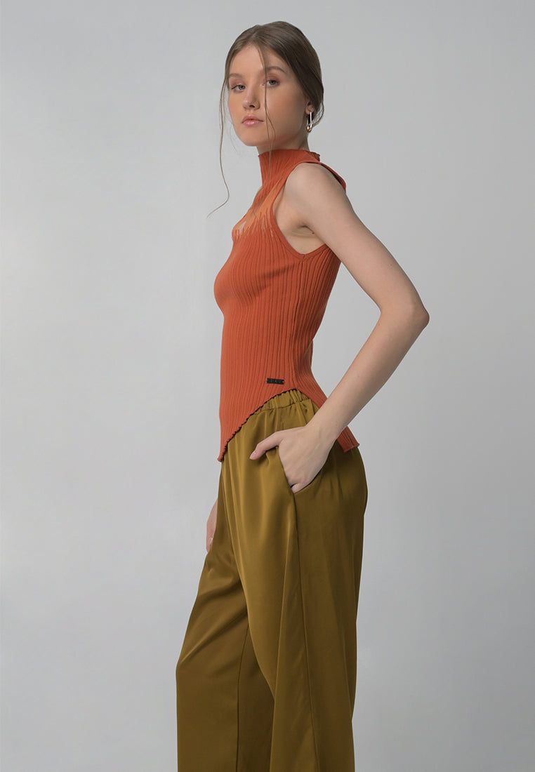 Sleeveless fitted knit top with abstract detailing, turtle neckline, and asymmetrical hemming.
