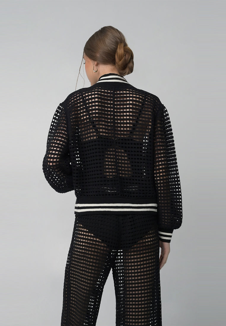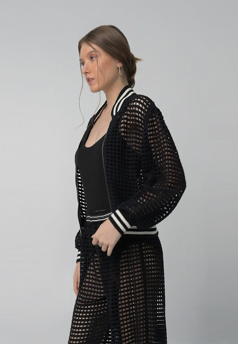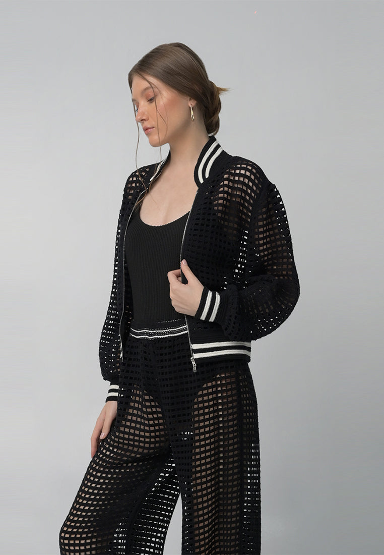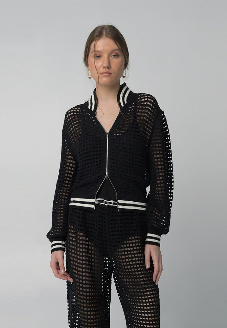 Bomber jacket inspired top with a mesh fabrication and accented with ribbing details along hem, sleeves, and collar.
