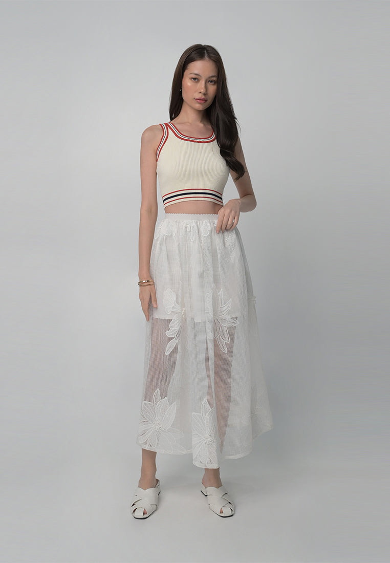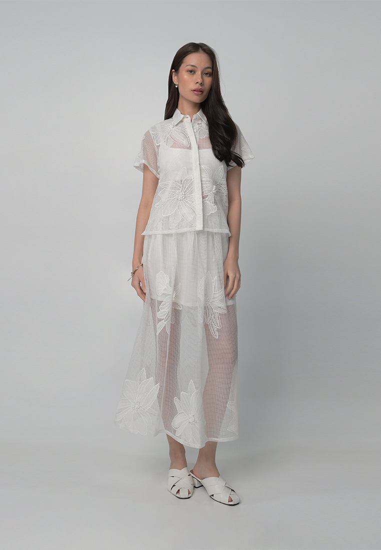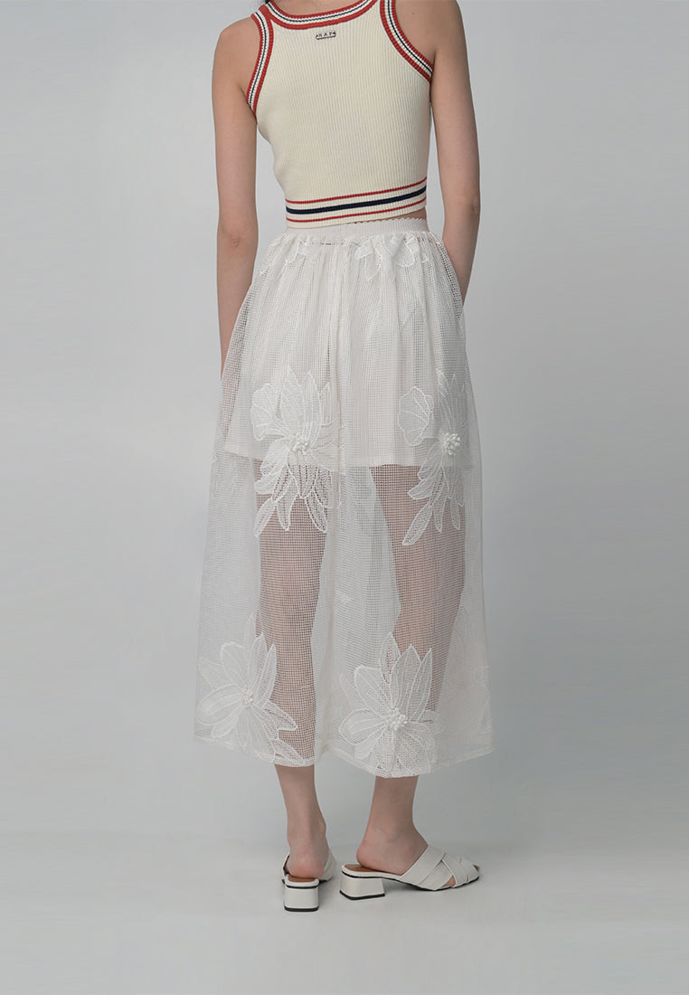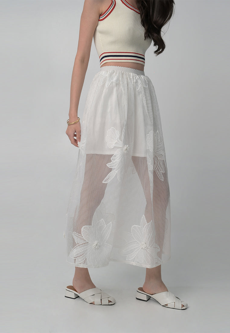 Mesh skirt features a floral motifs all-over, and flares down the hem with a delicate volume all over.
