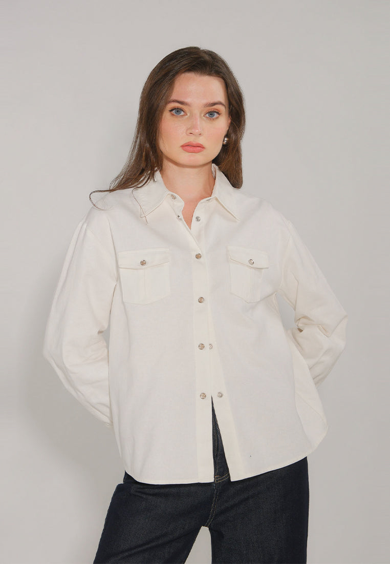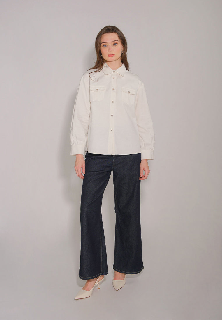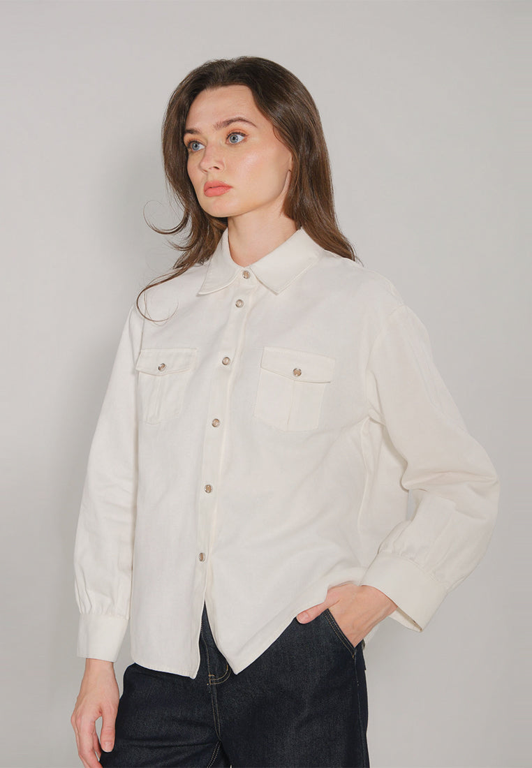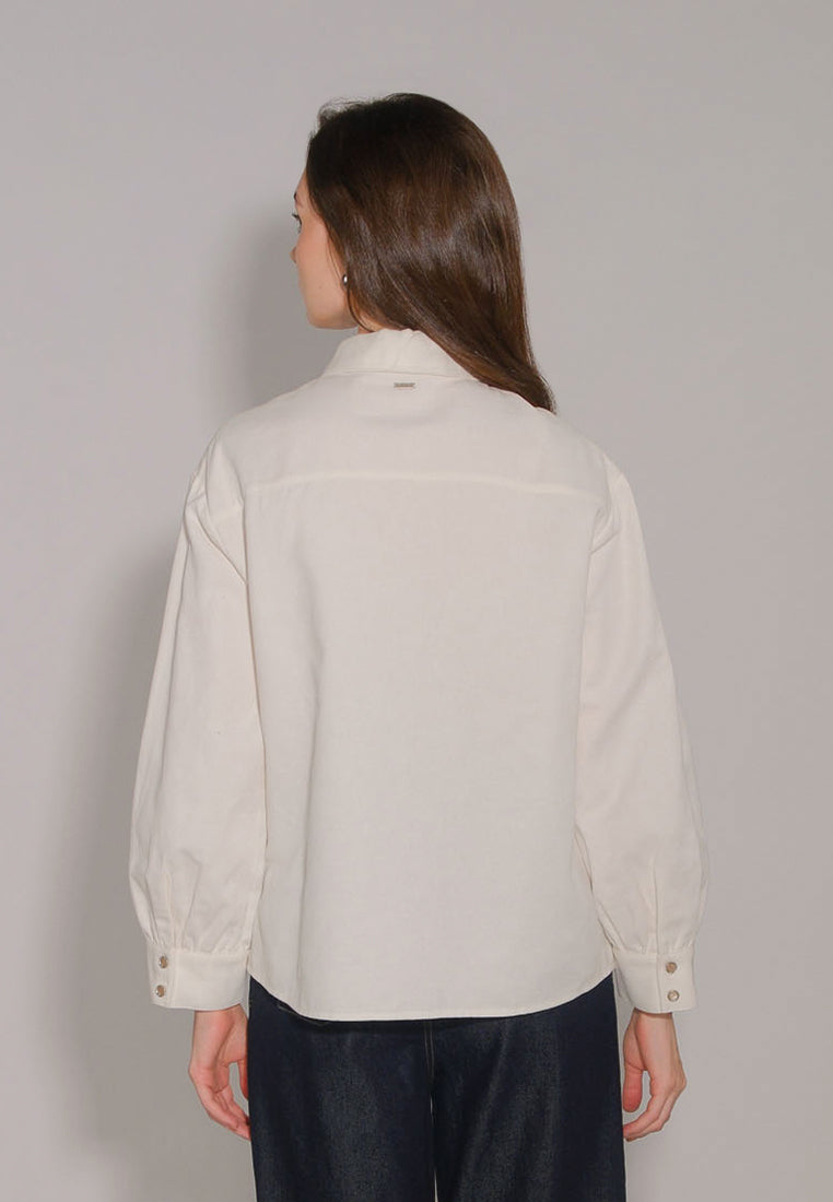 Long sleeved cotton twill top with a button down closure, classic shirt collar and front pocket details.