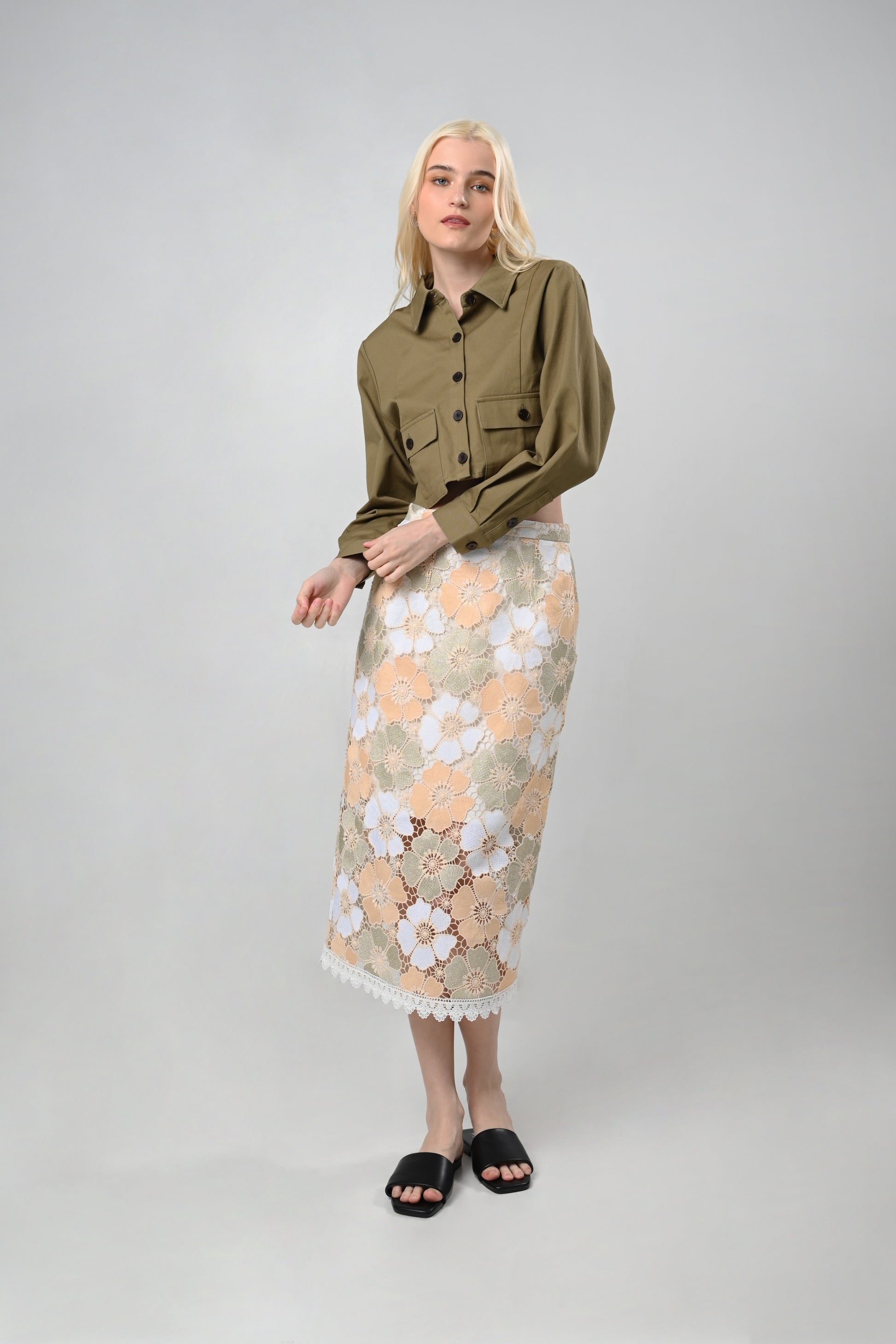 • Long sleeves with cuff button opening