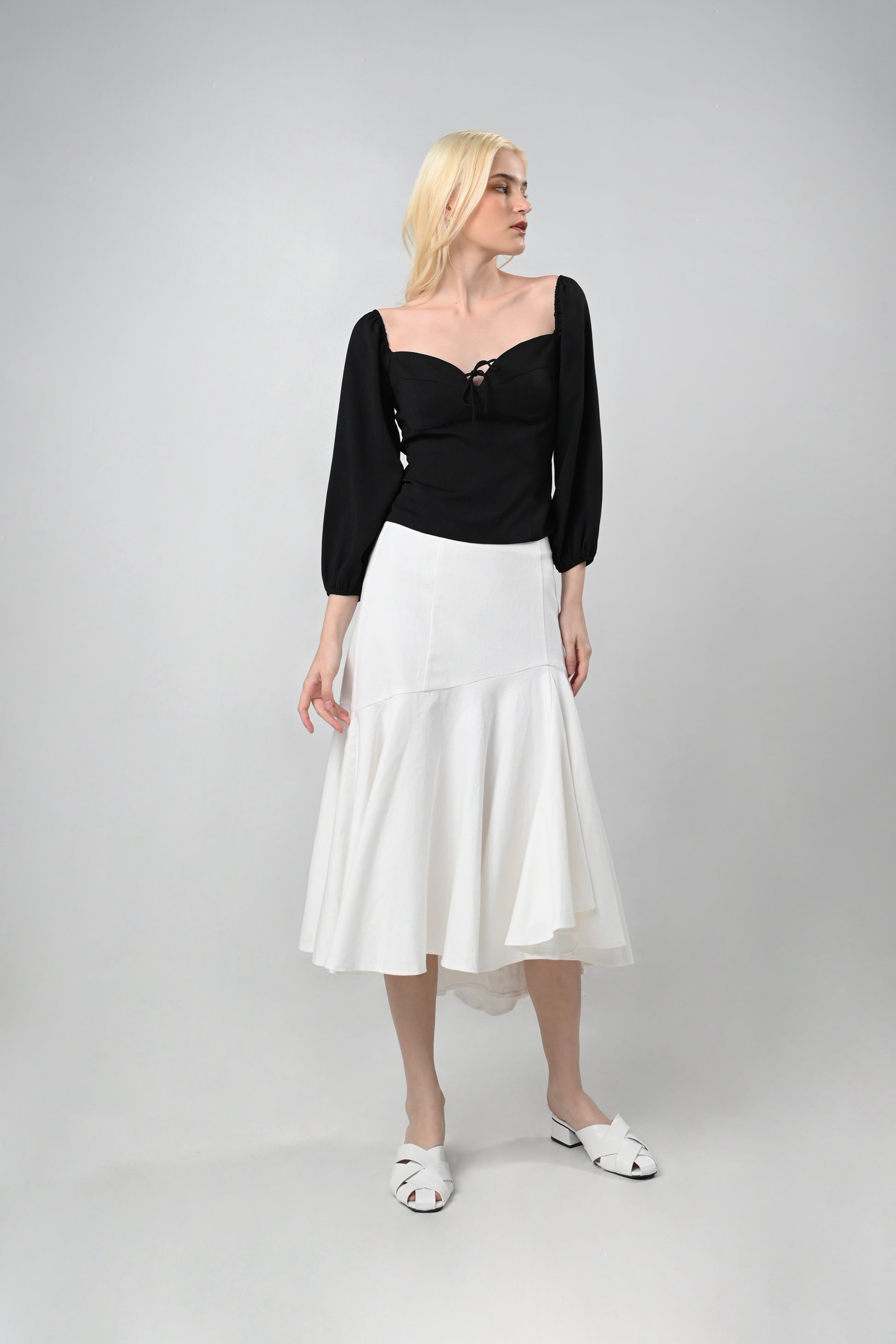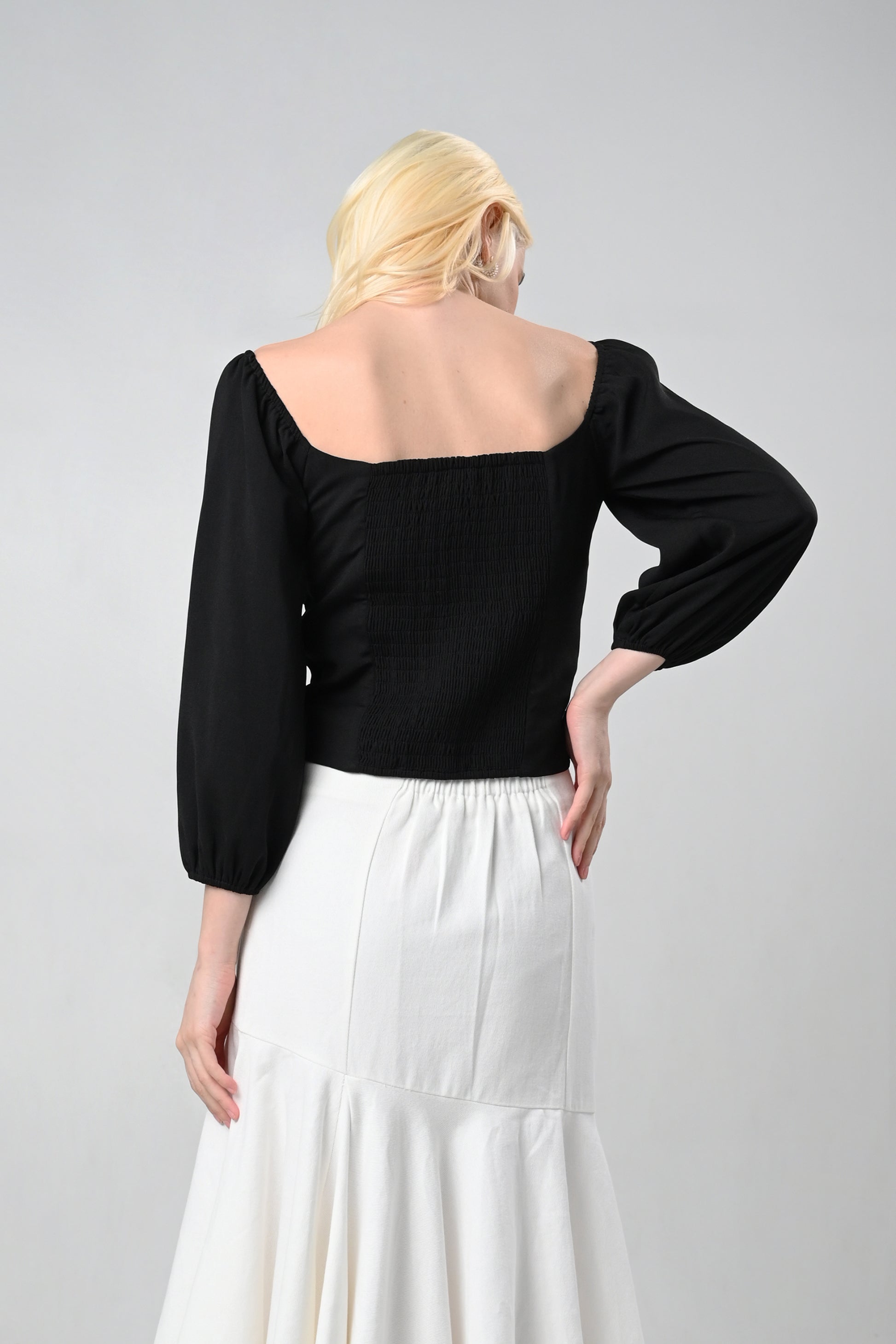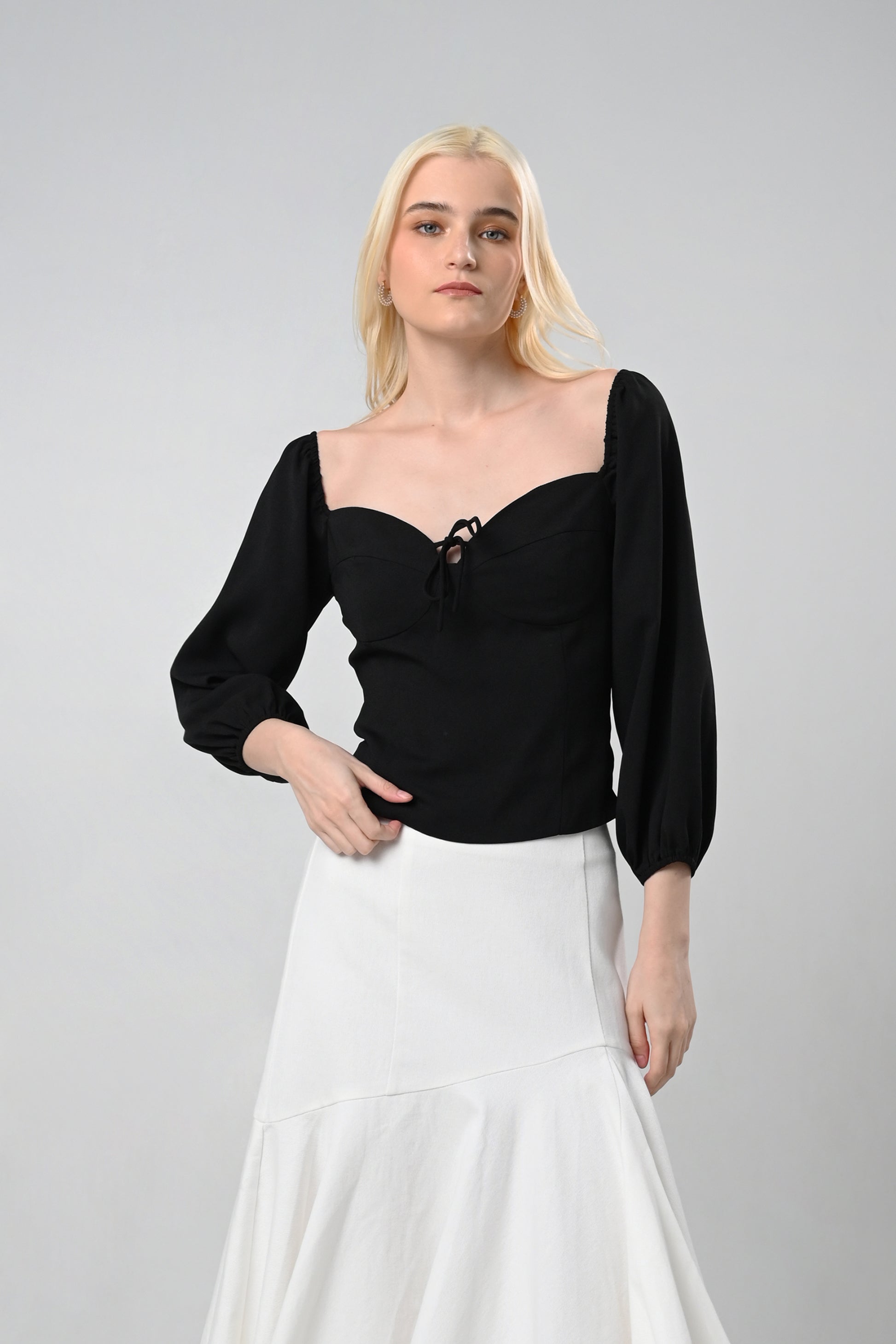 Summer sleek comes with a bit of coverage this season, but just enough with the RAF Clairo top. Off-shoulder top features long, sleeves attached to a fitted bodice with a sweetheart neckline.