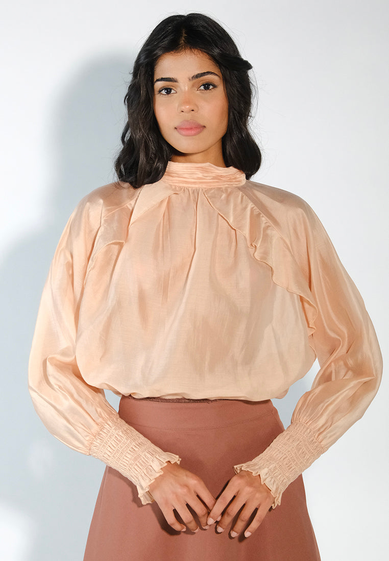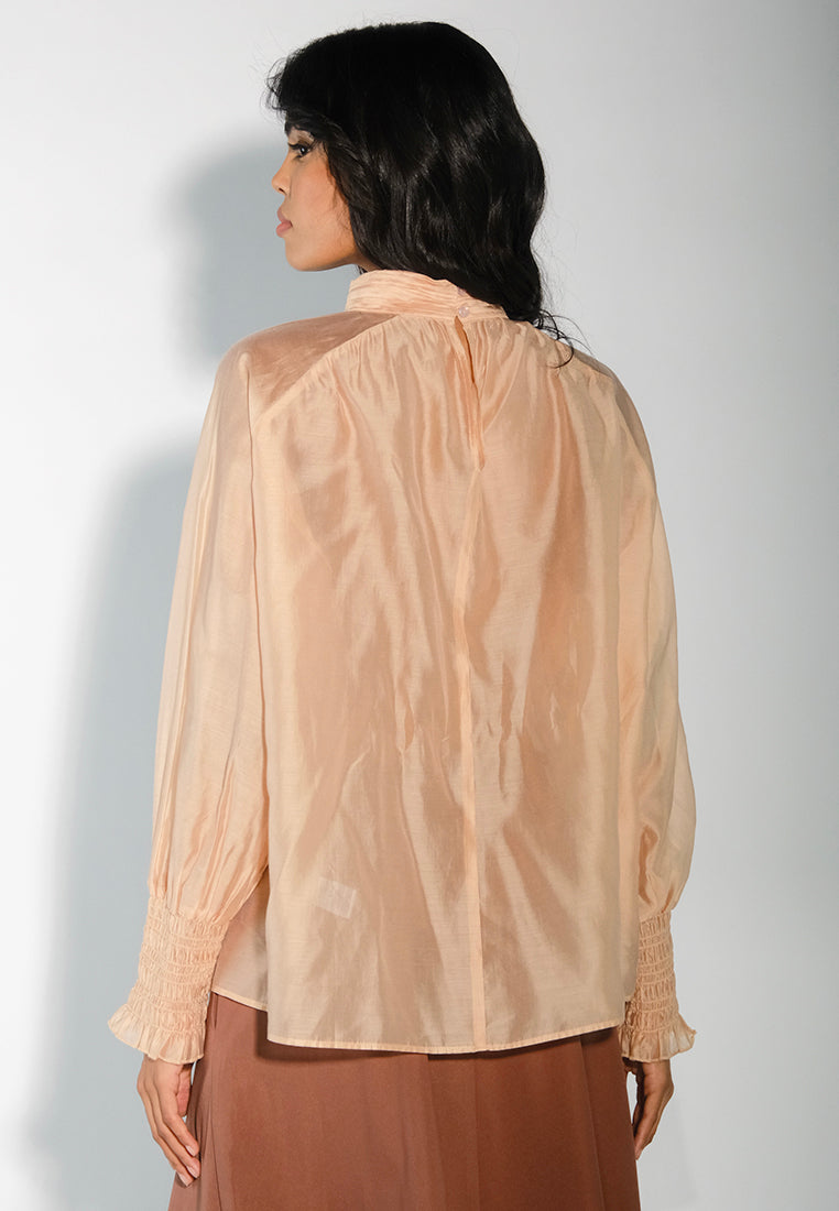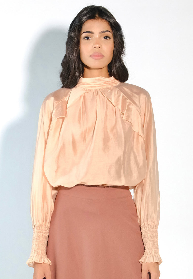 Long-sleeve top in poly-satin fabric with a regular-fit silhouette. Features a pleated turtleneck, smocking detail on the sleeves, and a back keyhole opening for a refined and elegant finish.