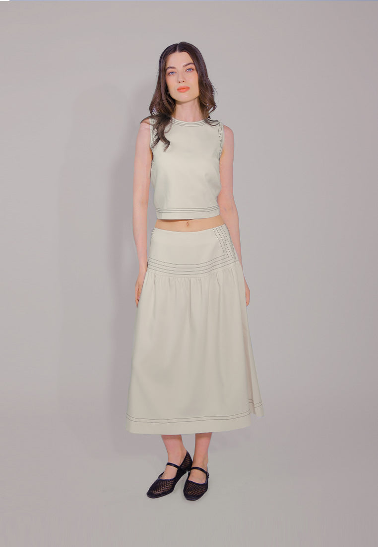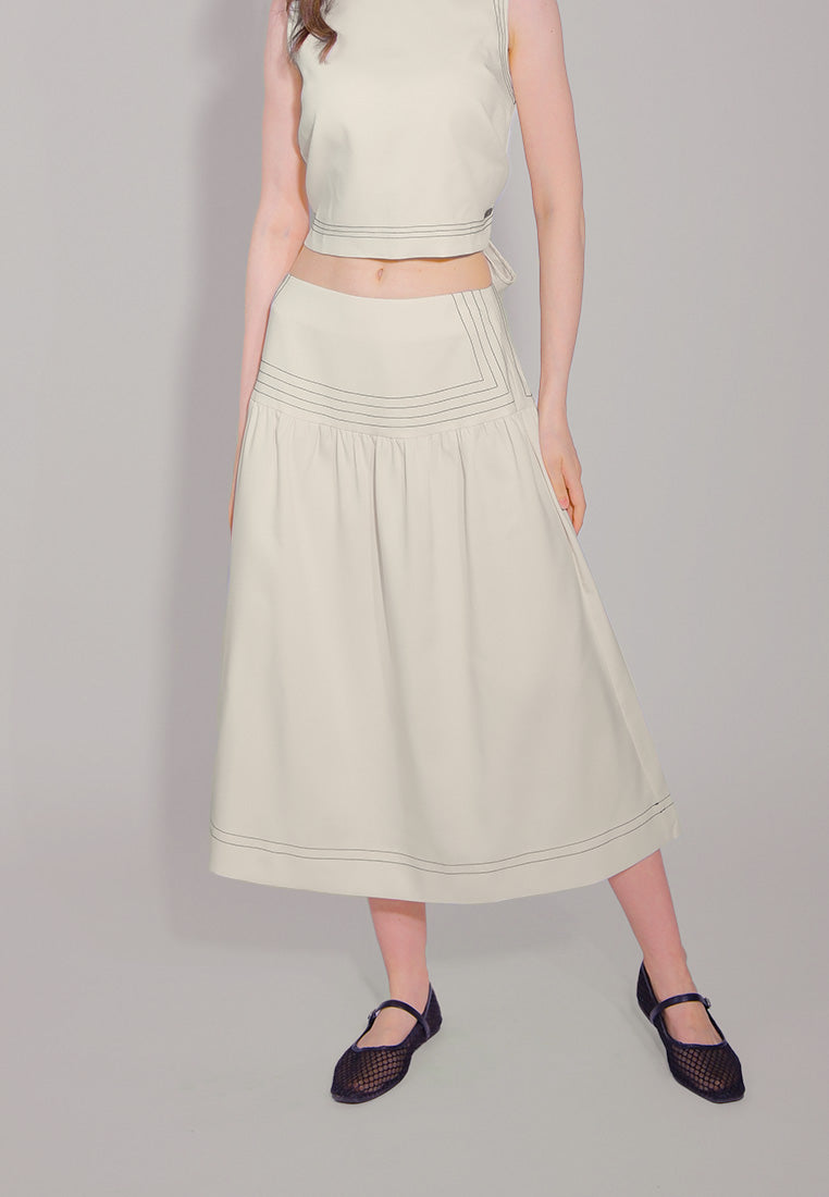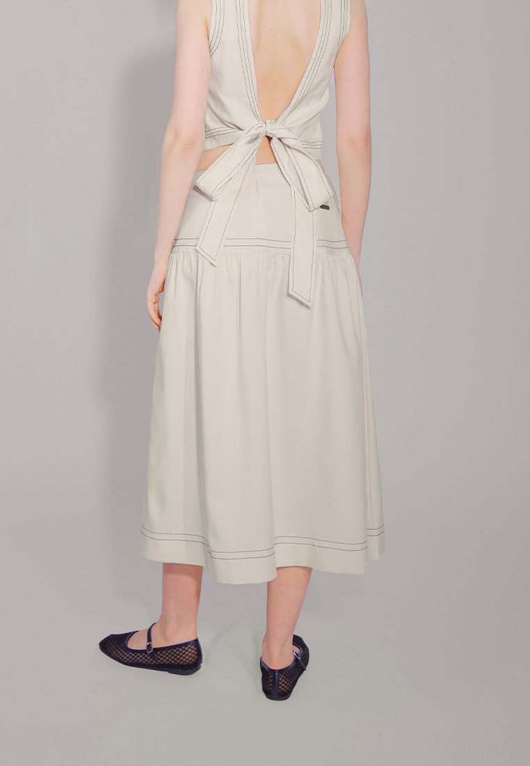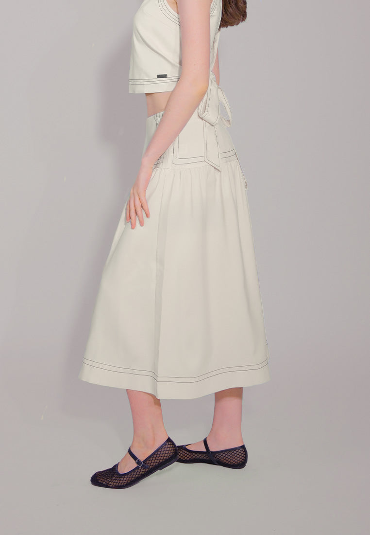 Prim and proper delicacy. The drop-waist skirt features contrast topstitching and a gathered skirt that falls below the knee.