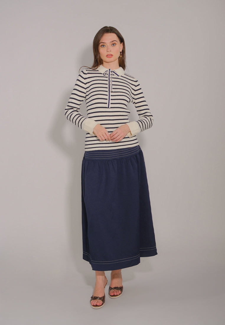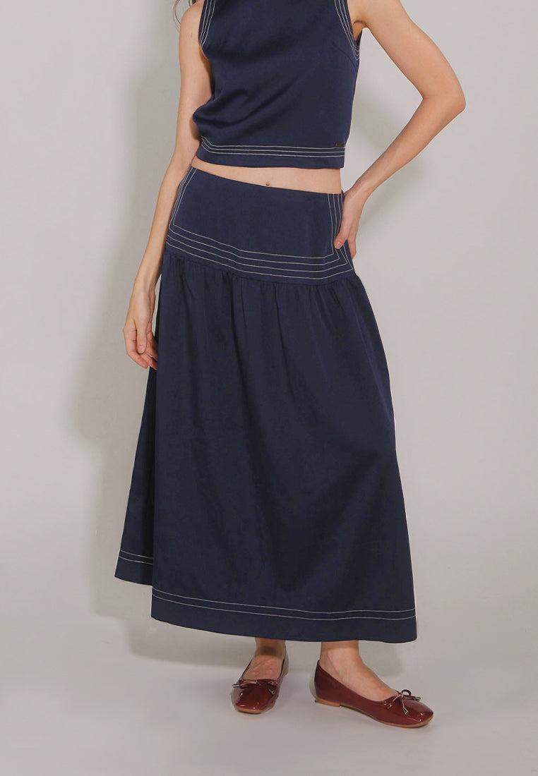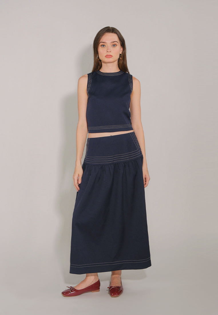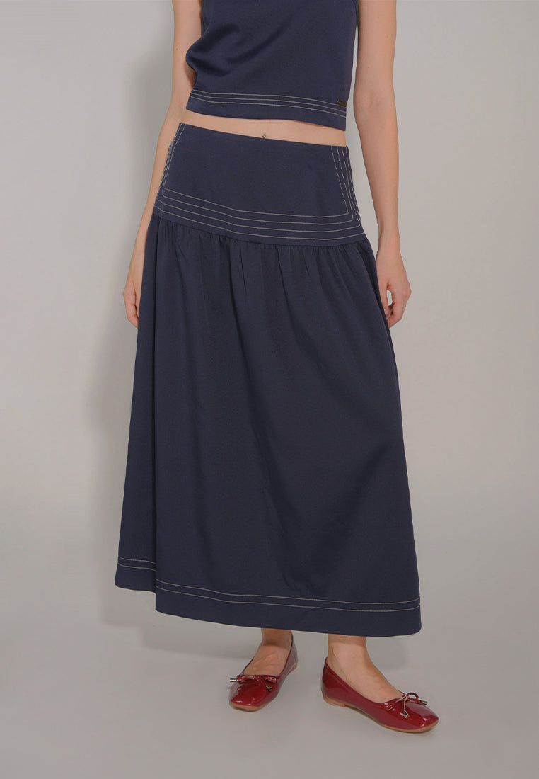 Prim and proper delicacy. The drop-waist skirt features contrast topstitching and a gathered skirt that falls below the knee.