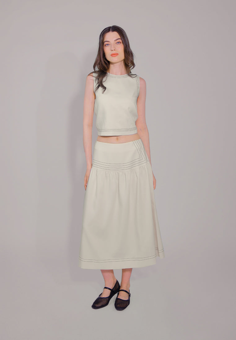 This stylish sleeveless top features a classic front bodice with a demure neckline but evokes a stylish teardrop cutaway detail on the back that secures with a bow detail.