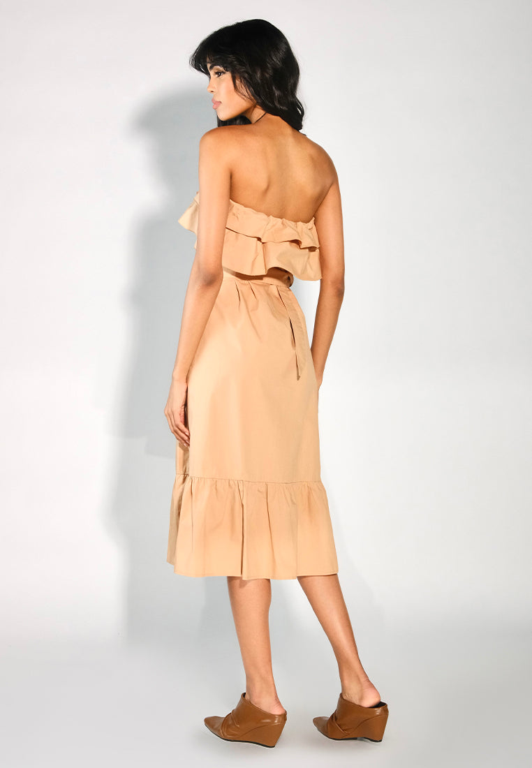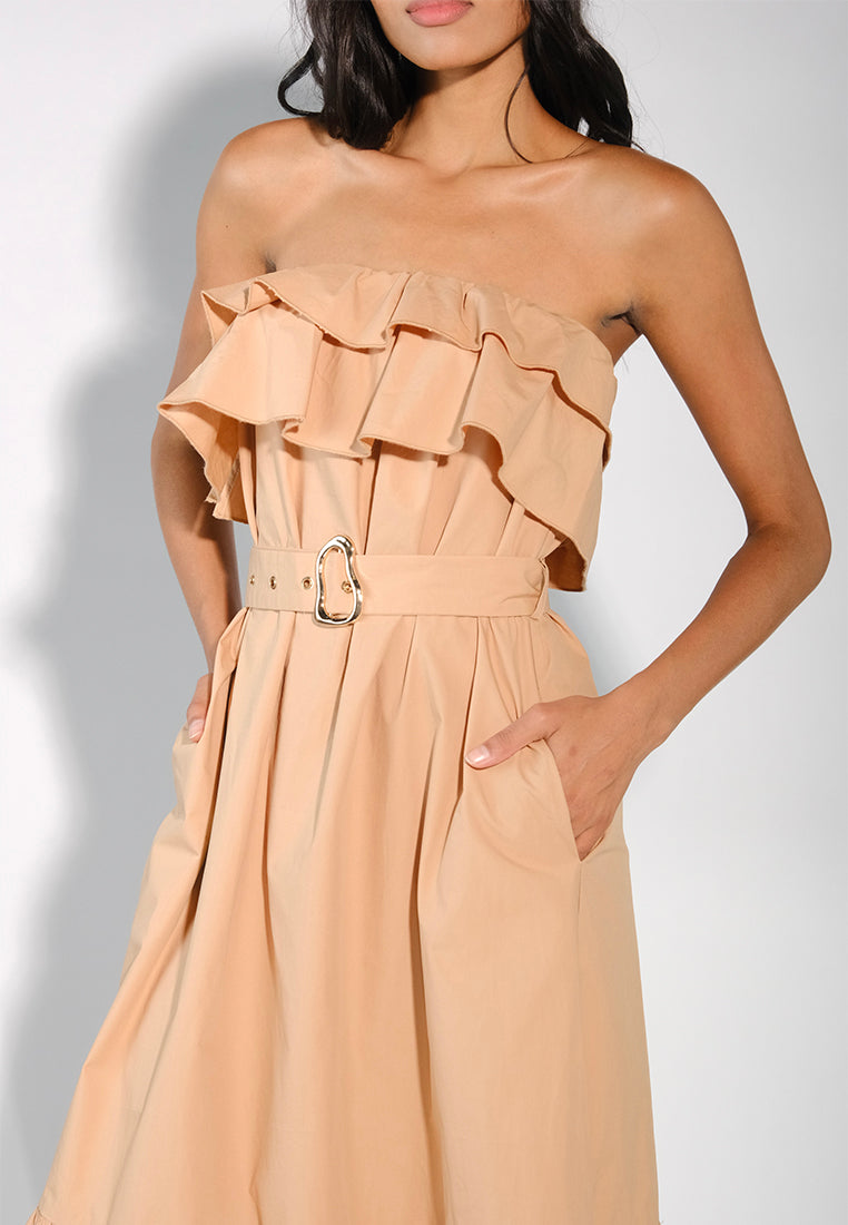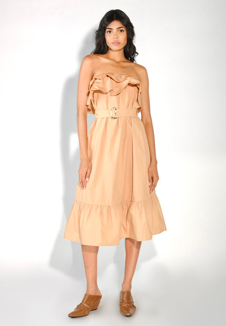 Strapless tube dress in cotton poplin fabric with a waisted silhouette, featuring a ruffle detail along the chest and a subtle flounce before the hem. Finished with a self-fabric belt and geometric buckle for a structured, flattering look.
