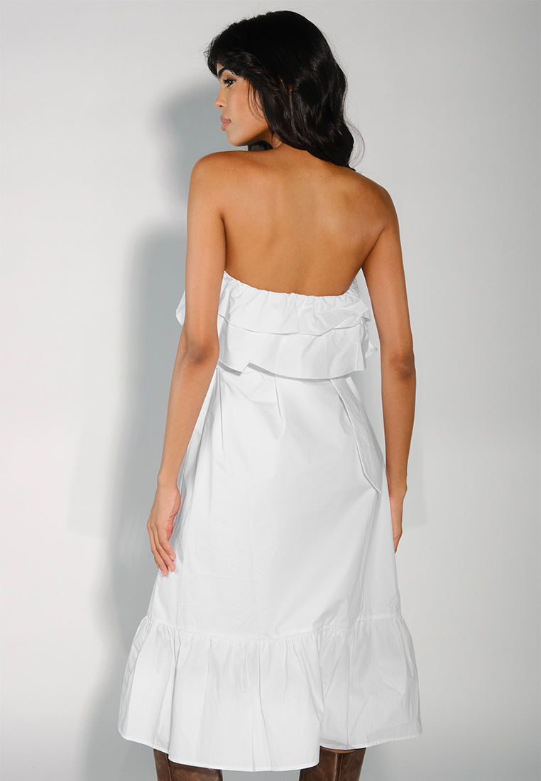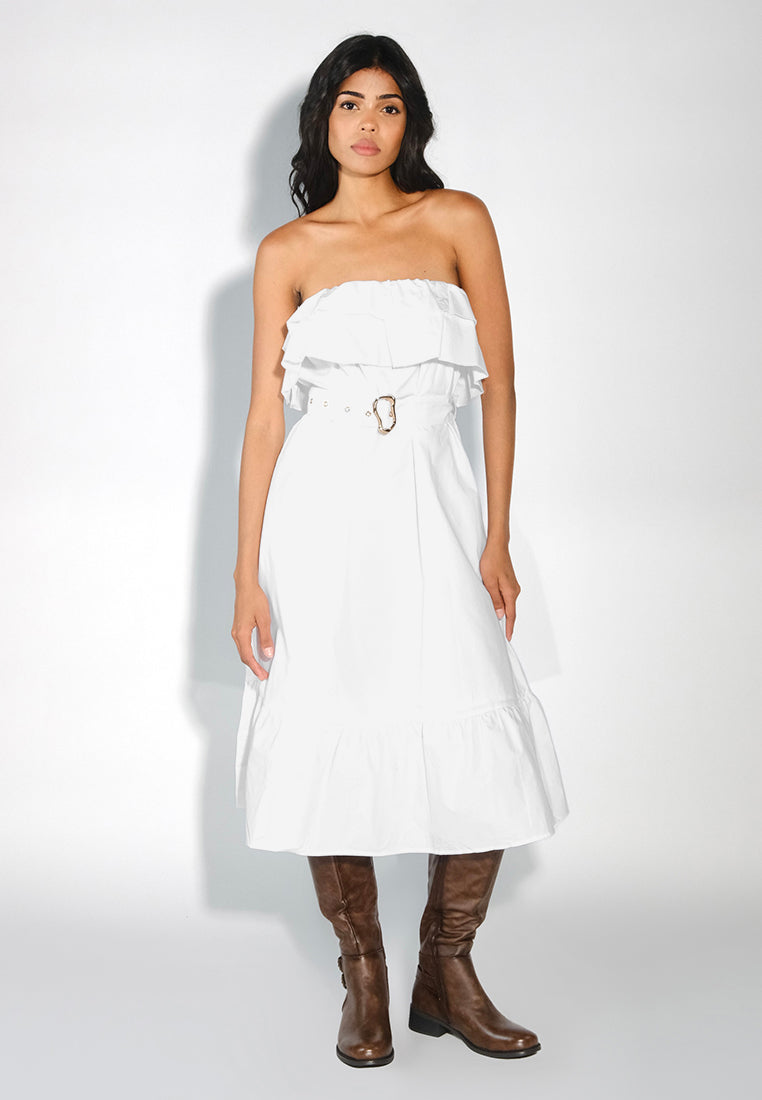 Strapless tube dress in cotton poplin fabric with a waisted silhouette, featuring a ruffle detail along the chest and a subtle flounce before the hem. Finished with a self-fabric belt and geometric buckle for a structured, flattering look.