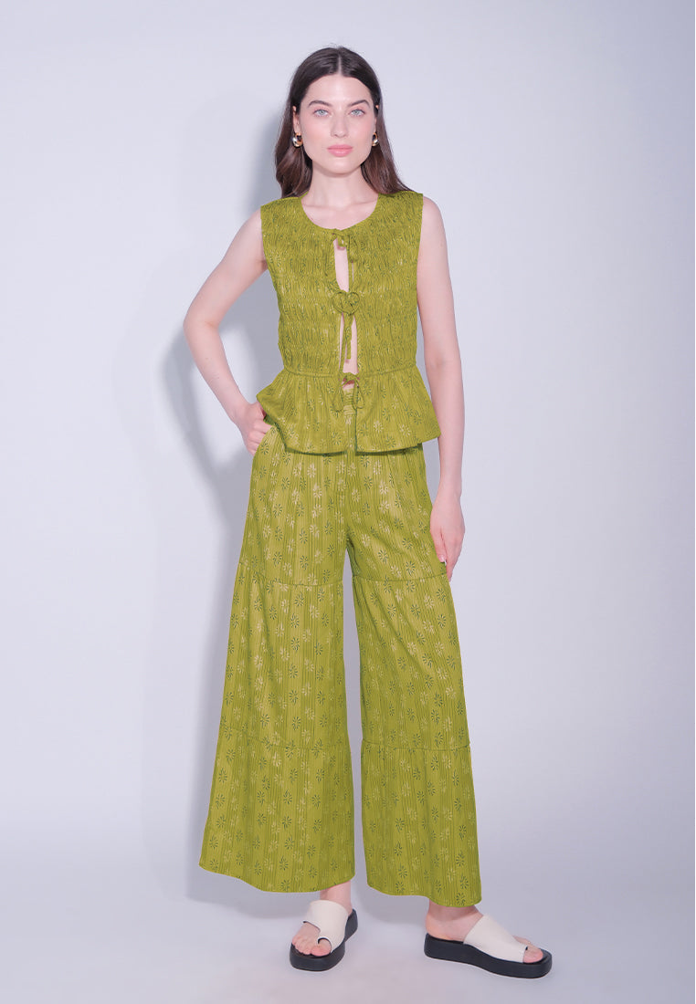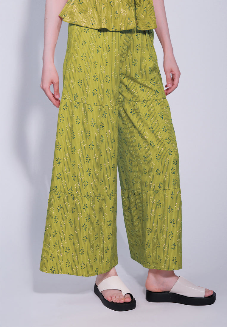 Wide-leg, flowy pants featuring subtle floral details and vertical lines in a two-tone color palette, finished with a three-tiered layered design for added movement and texture.