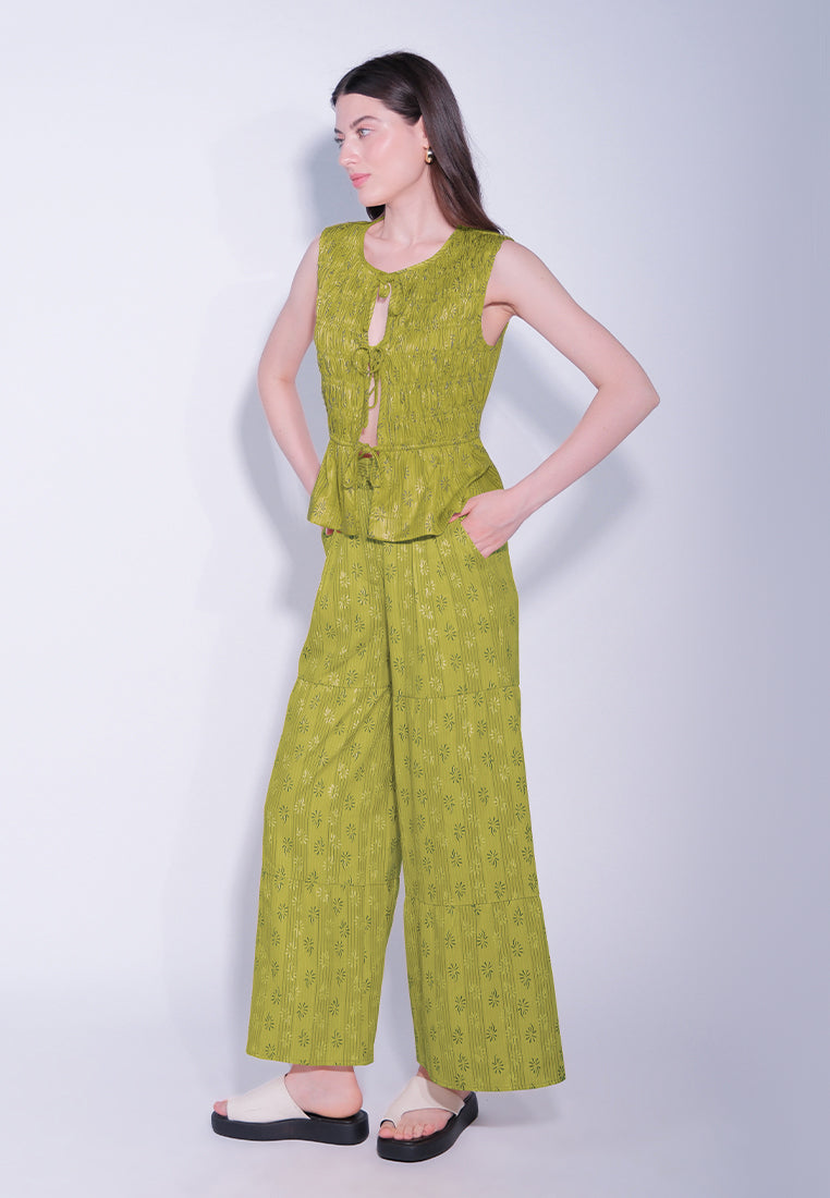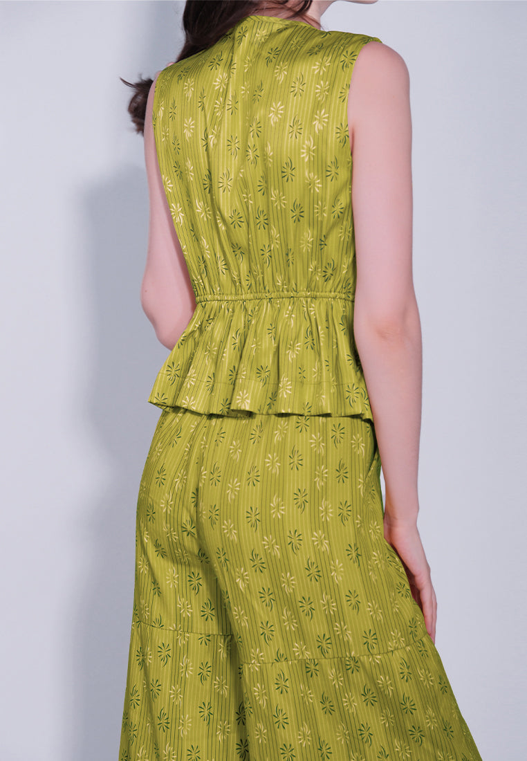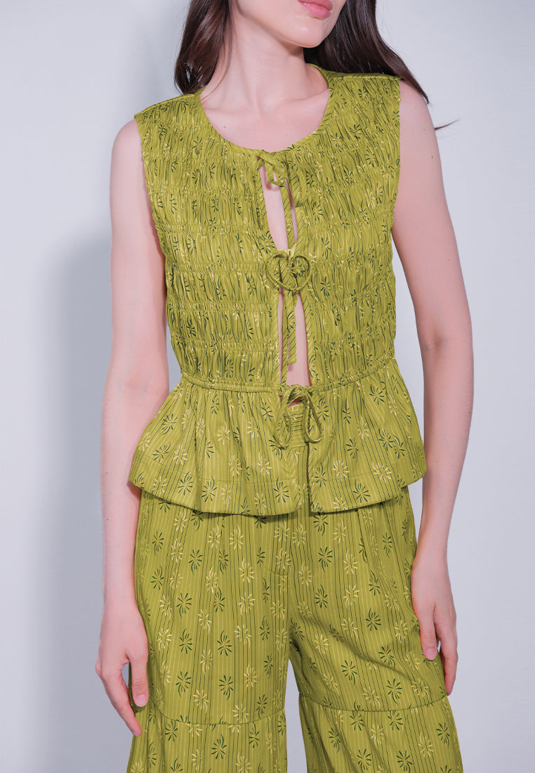 Sleeveless smocked detail top with a round neckline, featuring subtle floral details and vertical lines in a two-tone color palette. Designed with three ribbon ties down the center front and a flared, skirt-like hem for a soft peplum effect.