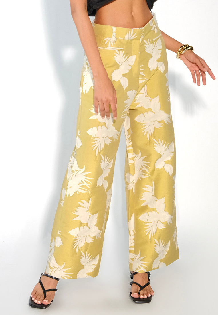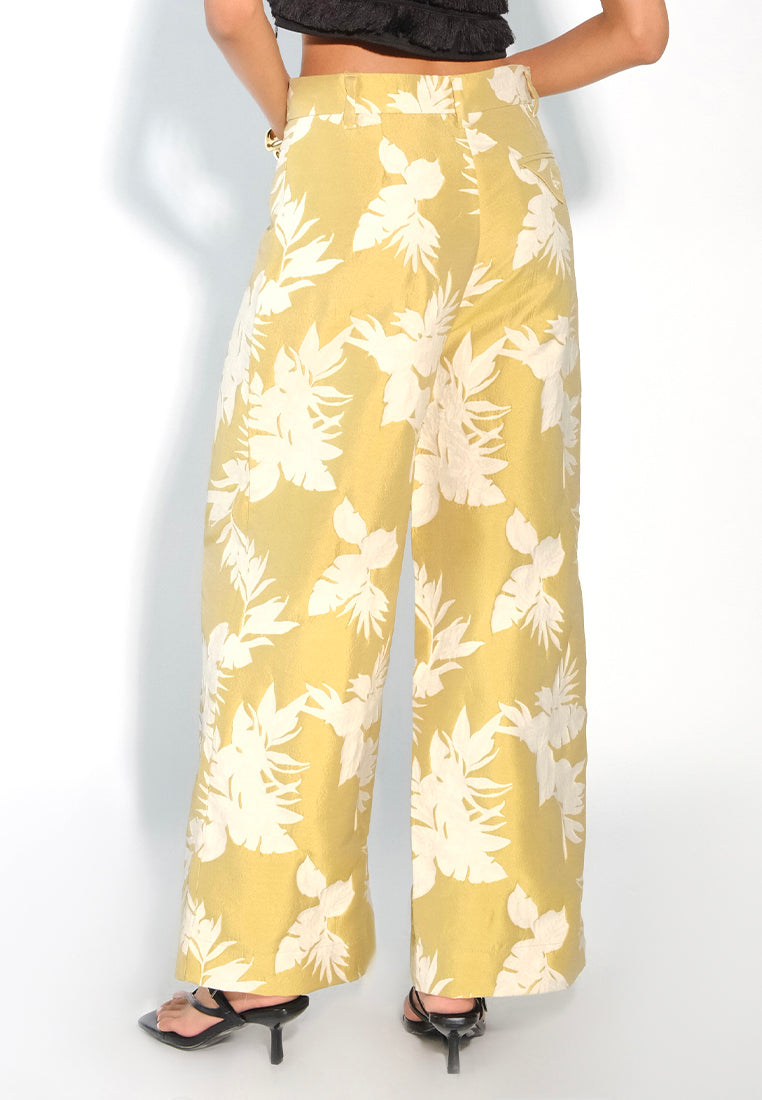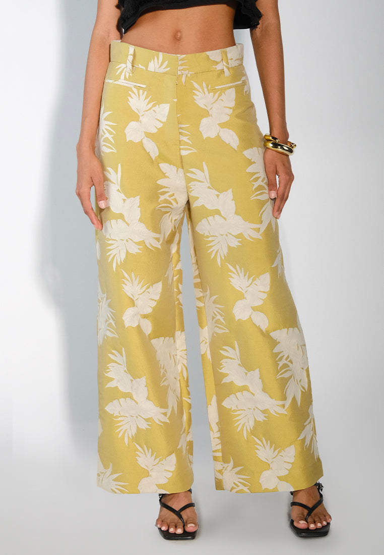 The high-waisted wide-leg pants in brocade fabric feature all-over leaf patterns in off-white over a lime base. Designed with a front zip closure, belt loops, side pockets, and welt pocket detail at the front for a polished, structured look.