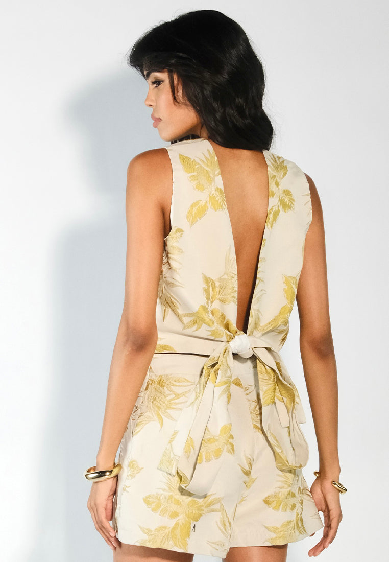 The brocade fabric sleeveless top boasts a regular fit silhouette, a round neckline, an open back, and a self-tie ribbon detail. The design features an all-over leaf pattern in lime on an off-white background.