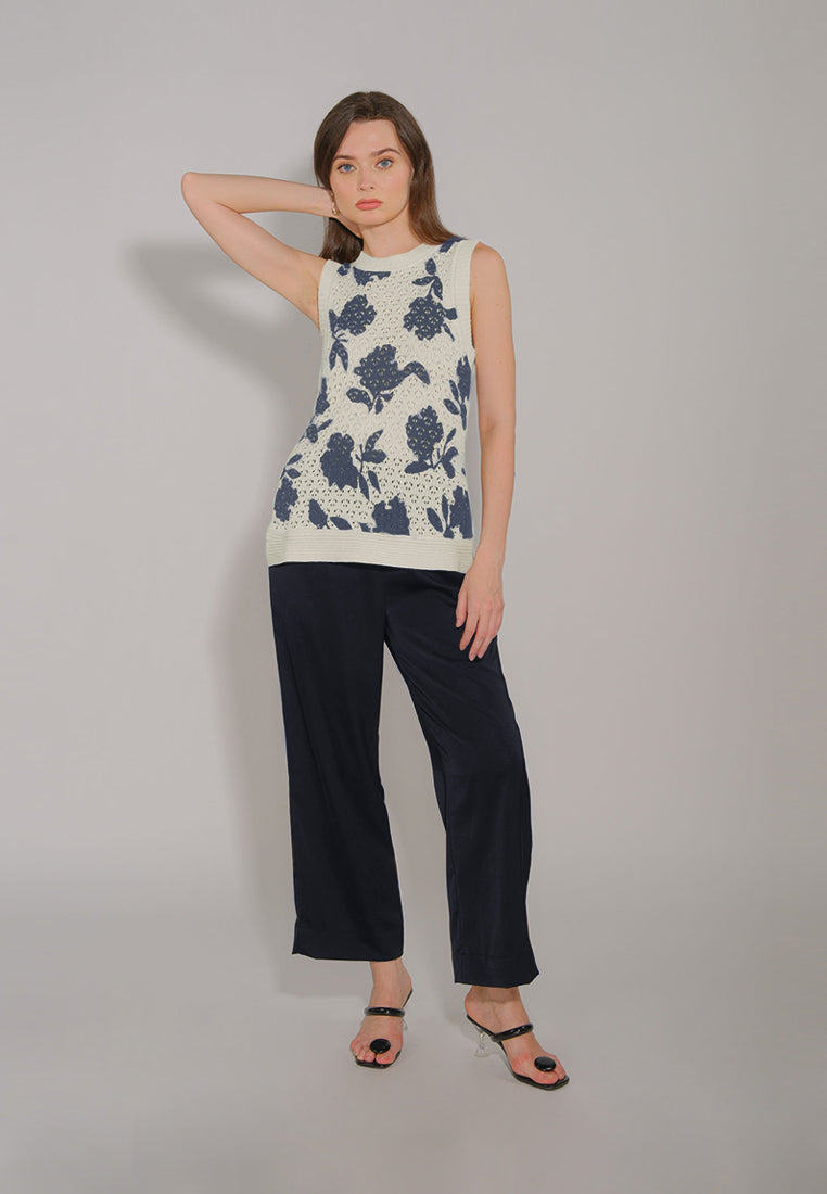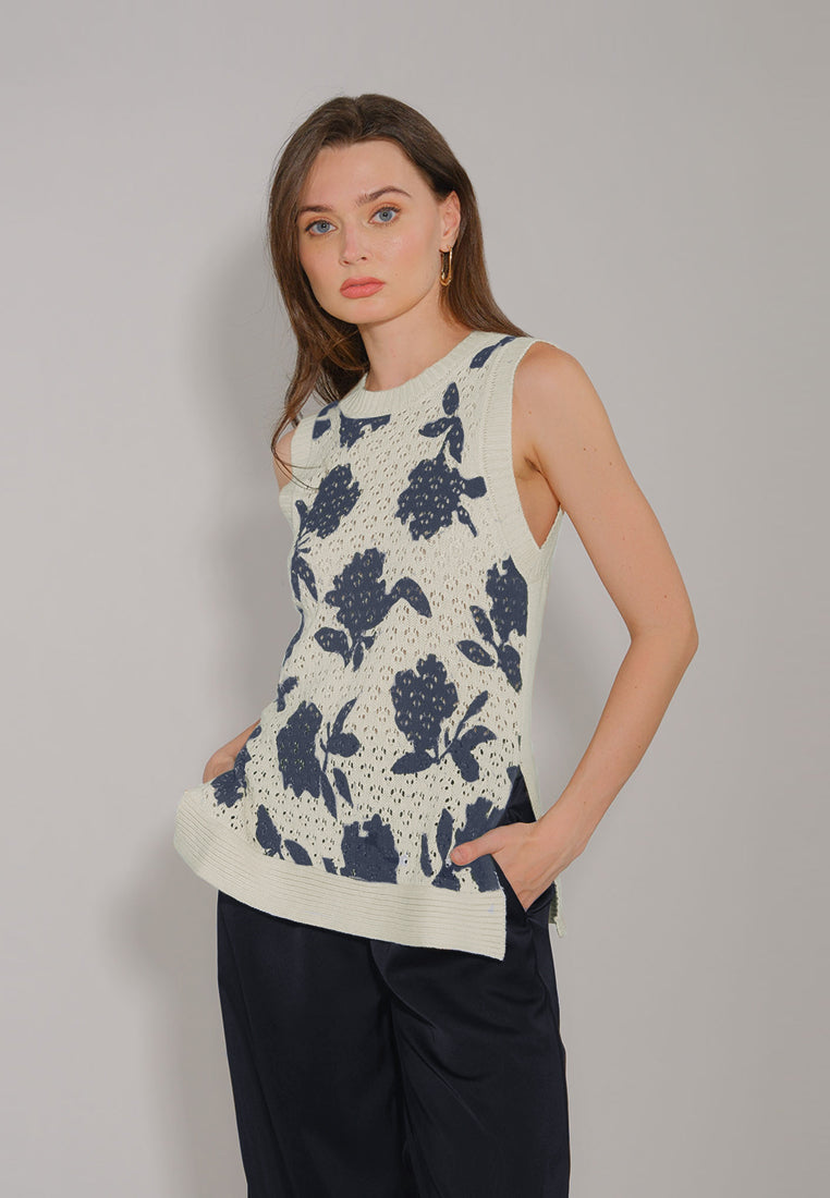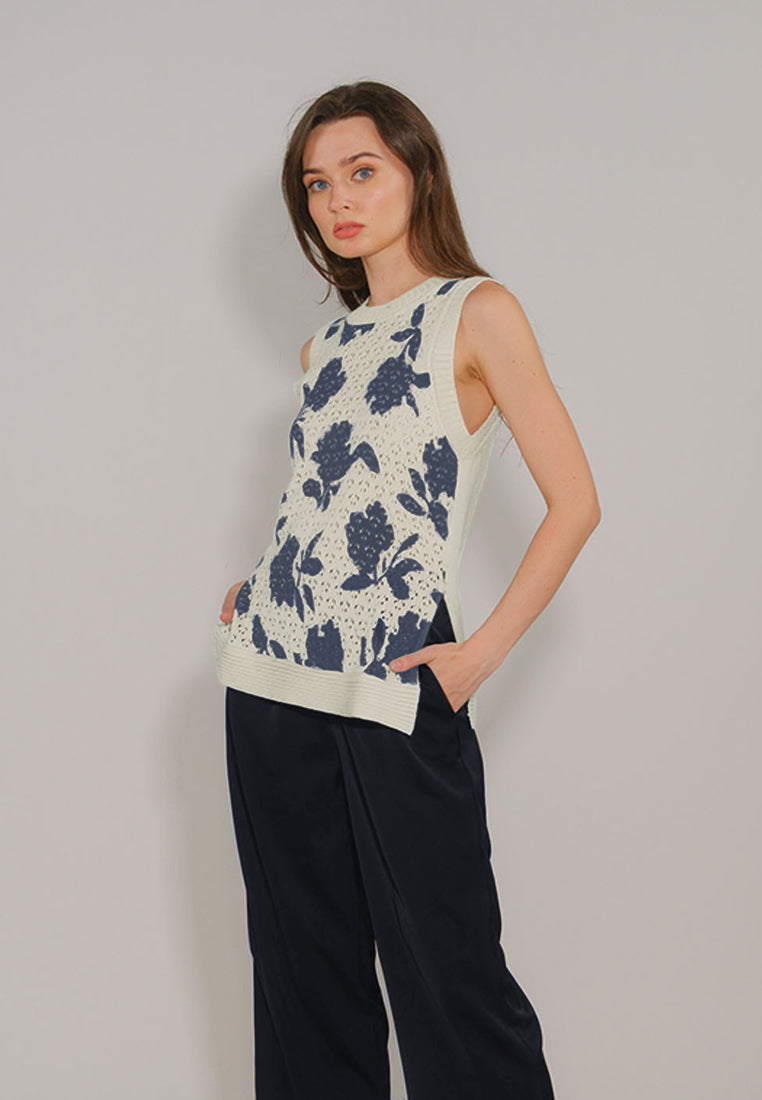 The flat knit top features a sleek, delicate fit with ribbing details along the armhole, neckline, and hem and features a delicate floral motif all over.