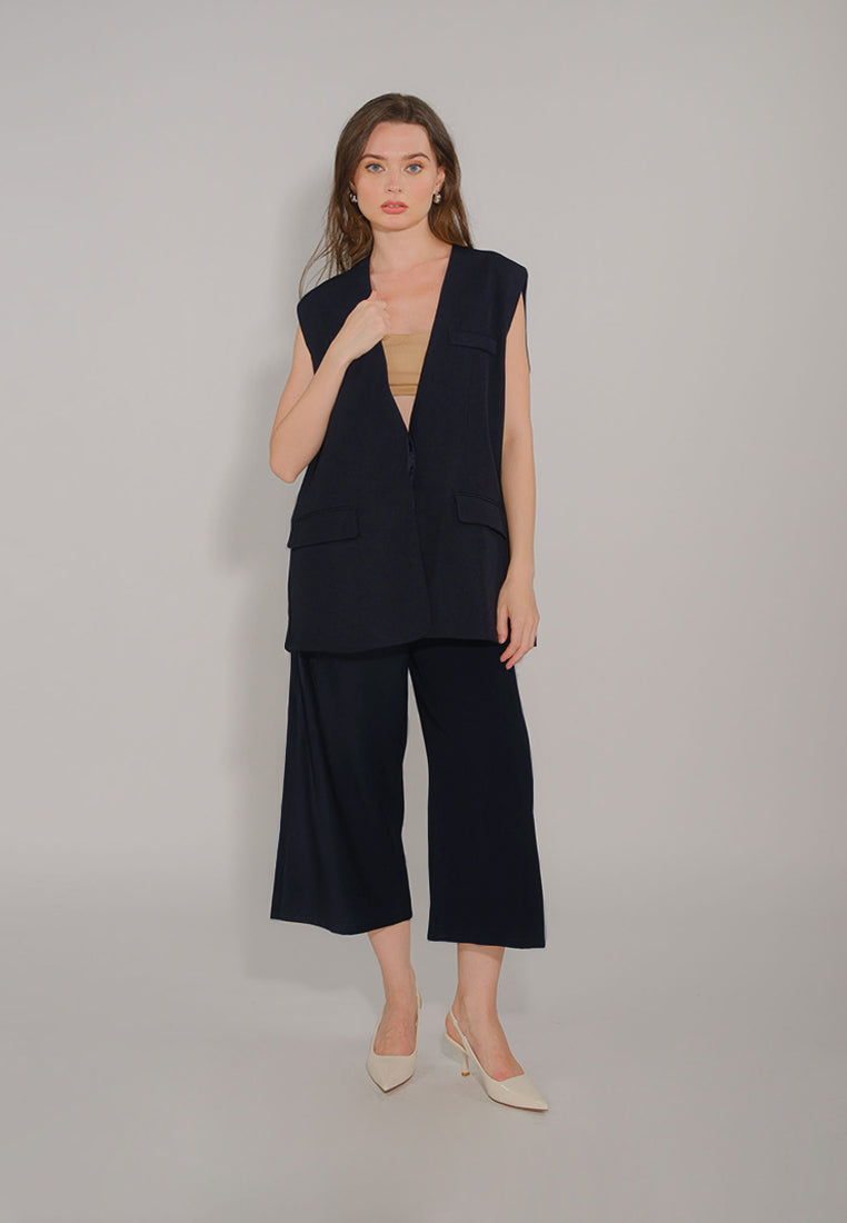 The relaxed-fit vest features an oversized silhouette, a single-breasted closure, and front pocket details.
