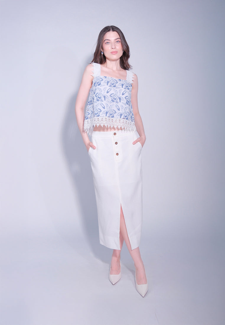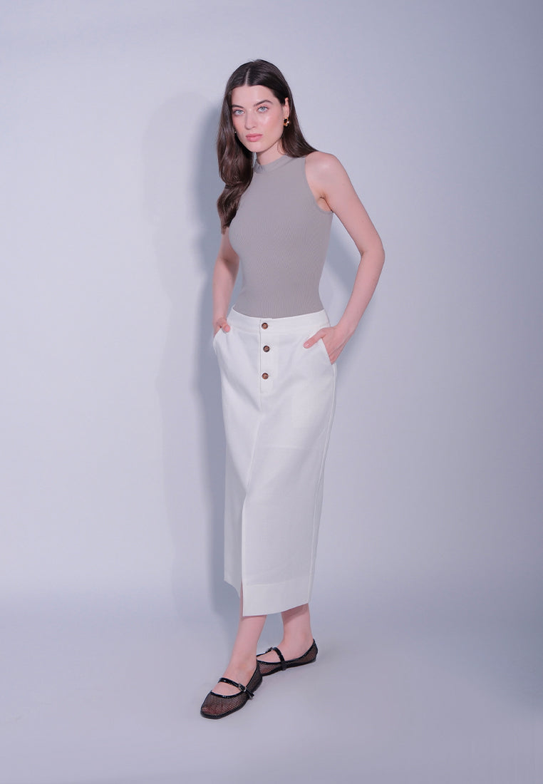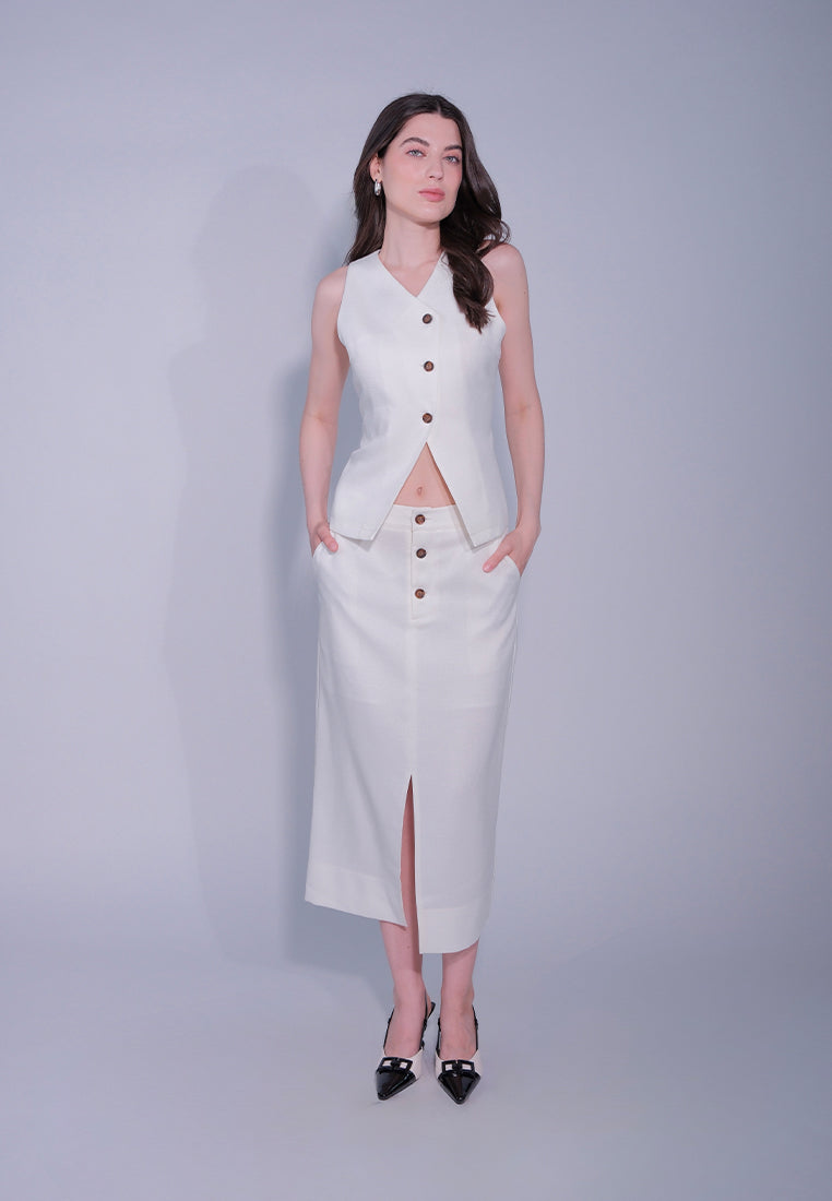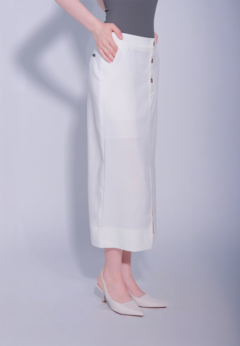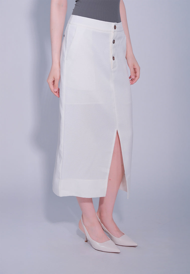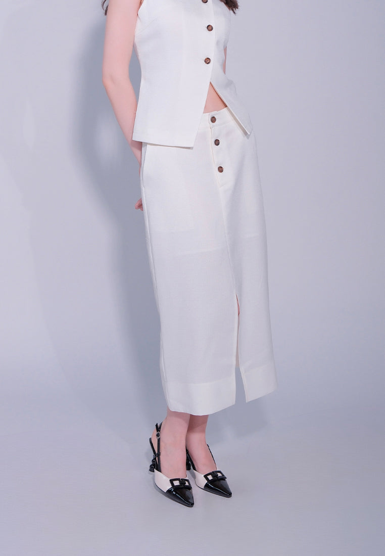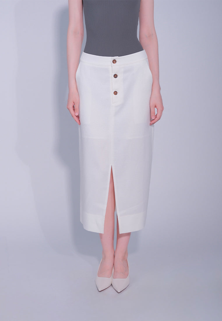 Long skirt featuring three buttons at the center front and a front slit for added movement.