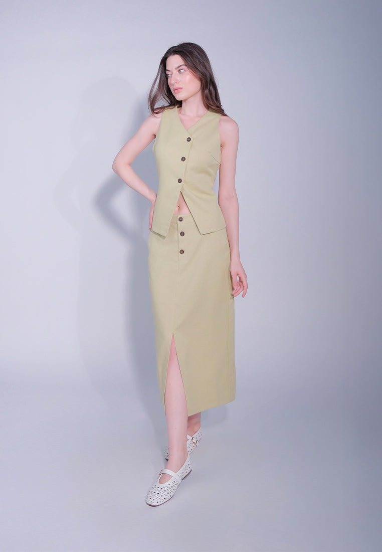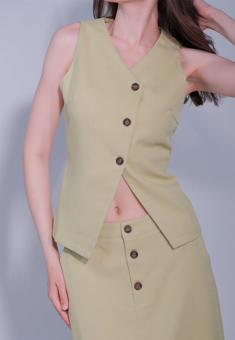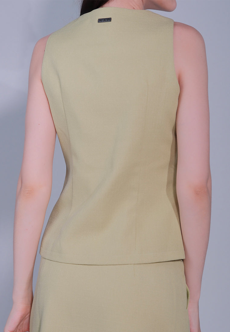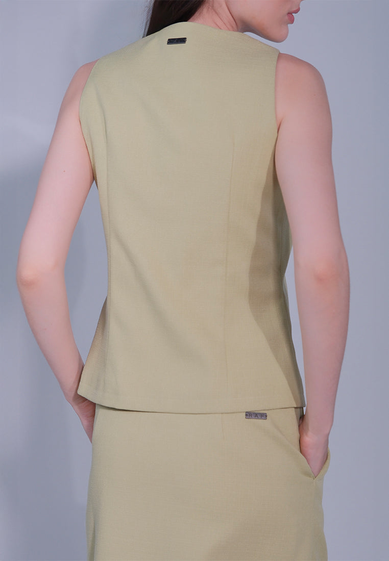 Vest with a V-neckline and three-button closure, creating an open, downward V shape at the hem for a subtly structured and flattering silhouette.