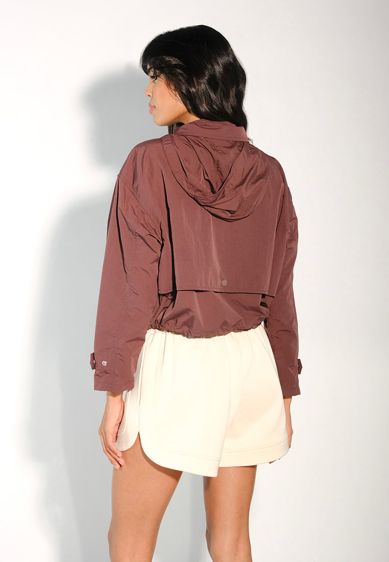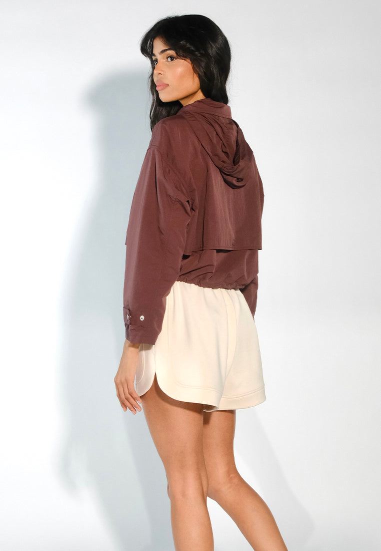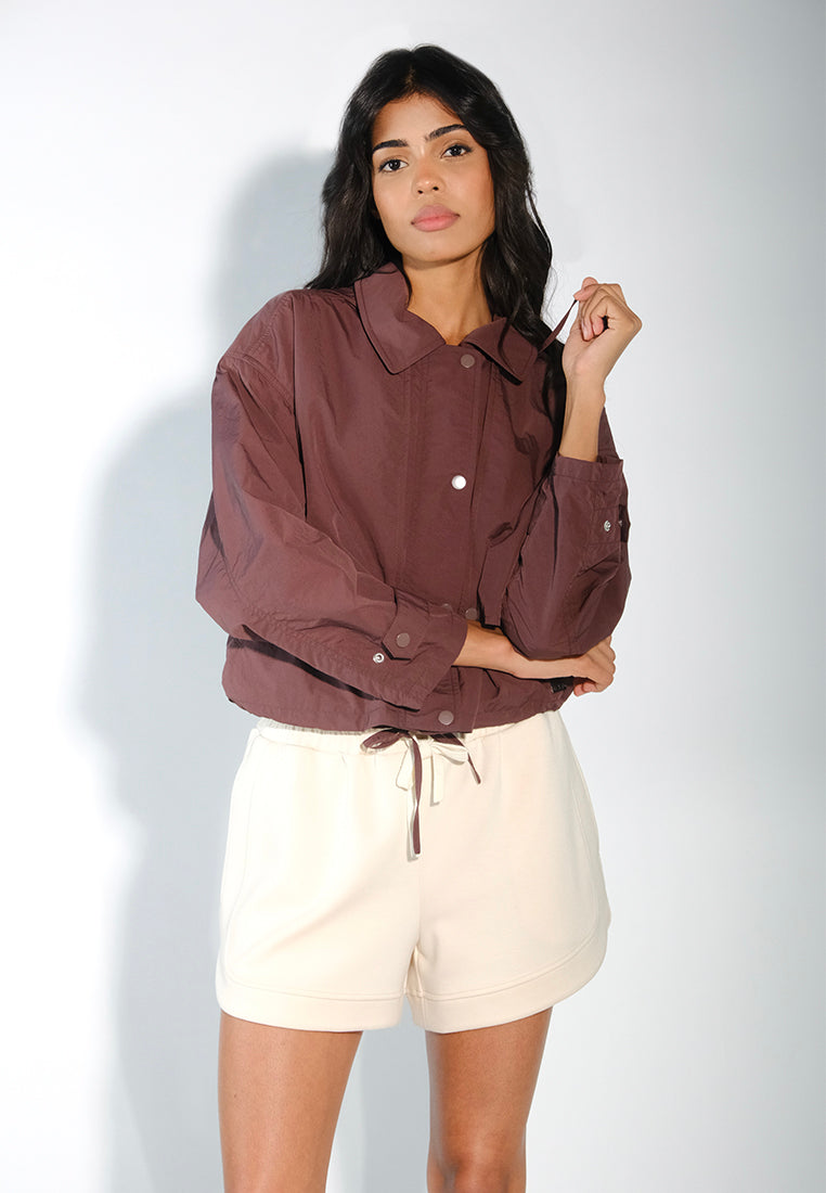Long-sleeve top in taffeta material with a front button closure, featuring side fabric panels from upper to lower chest, each secured with a button for added structure. Finished with an adjustable drawstring at the hem for a customizable, gathered fit.
