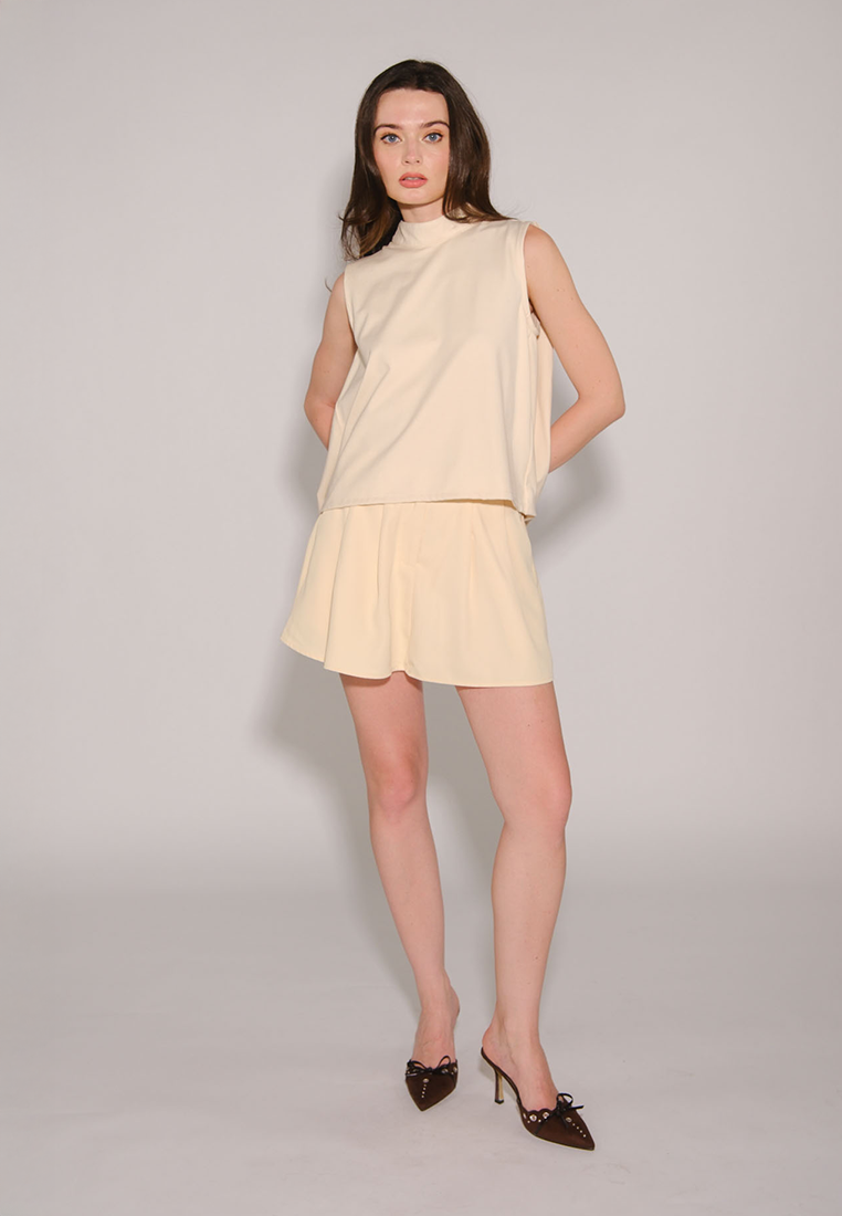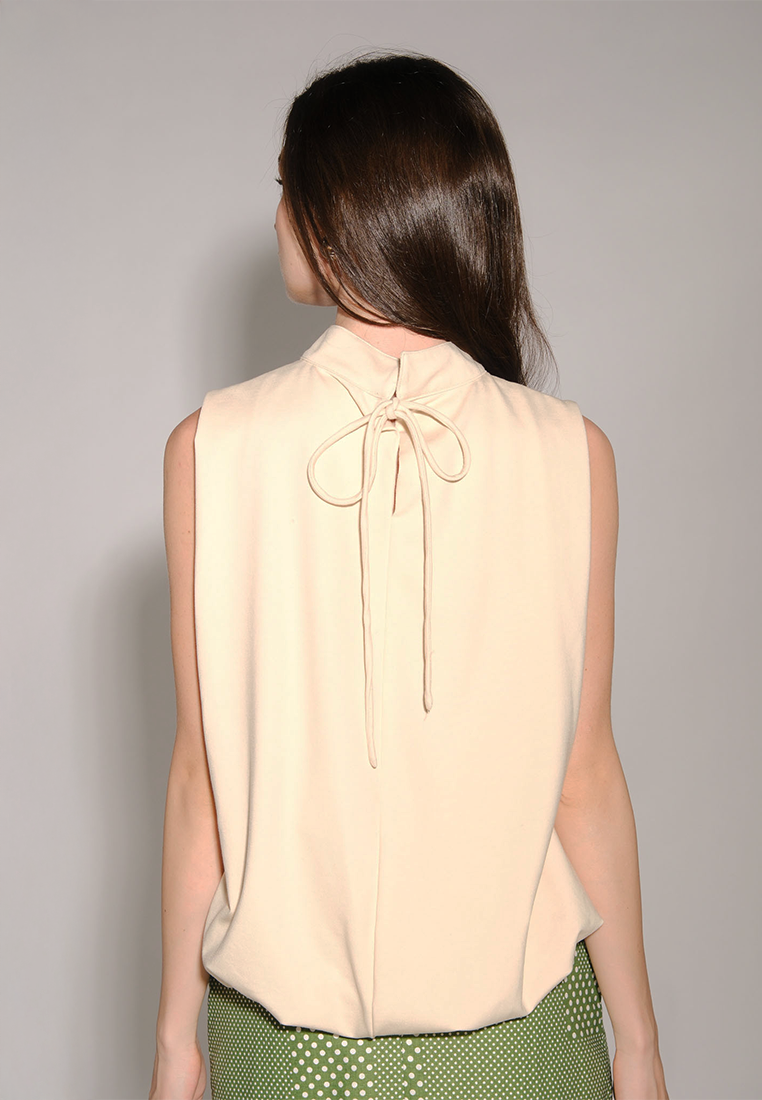 Sleeveless turtleneck top with a ribbon closure on the back panel and a bubble hem.