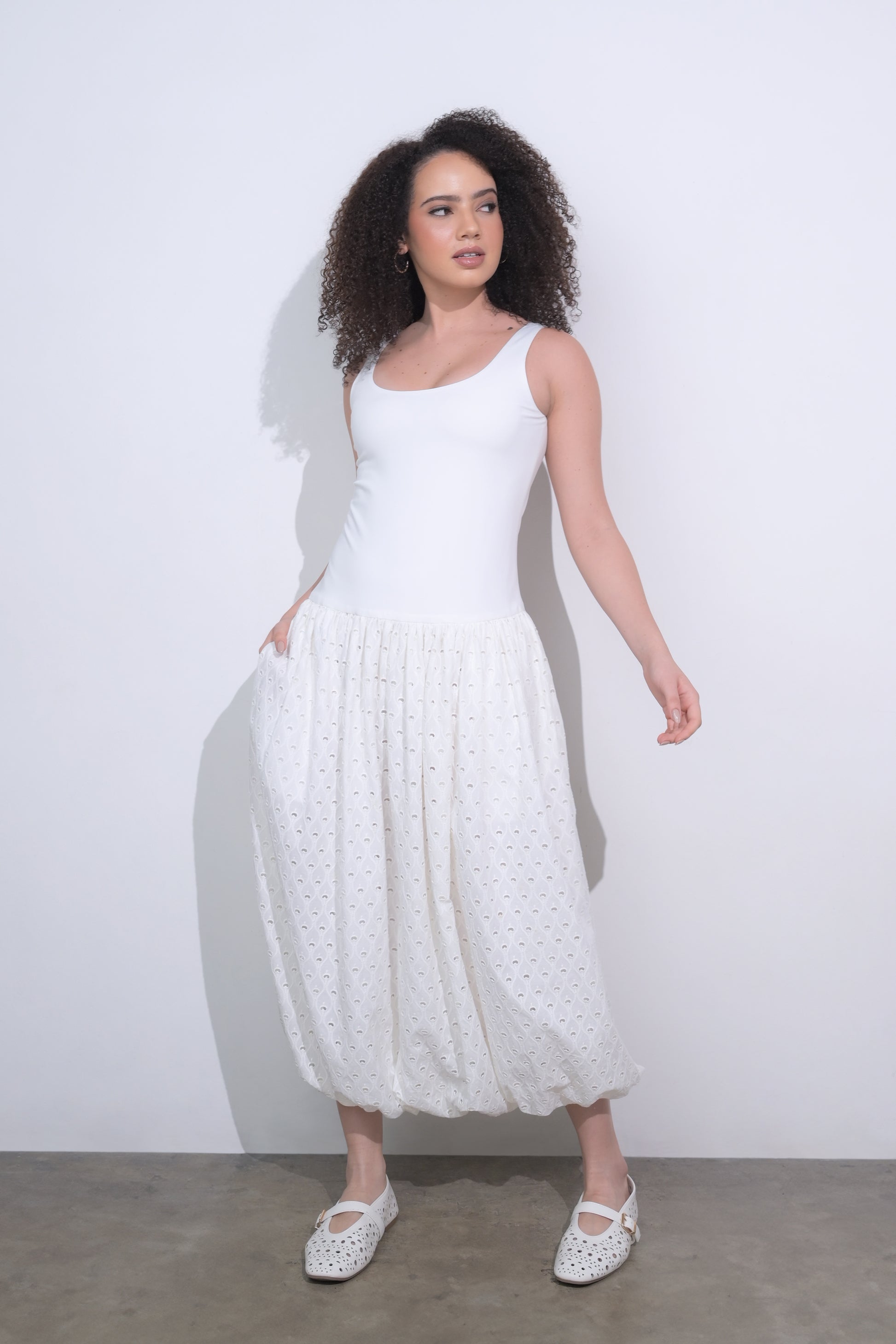 Easy made chic. The Elixir dress envisions simplicity with an elegant twist, featuring a sleek bodice with a scoop neckline, and lace bubble skirt that hobbles with every movement.