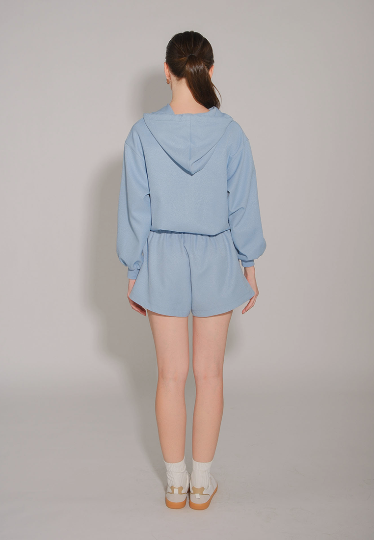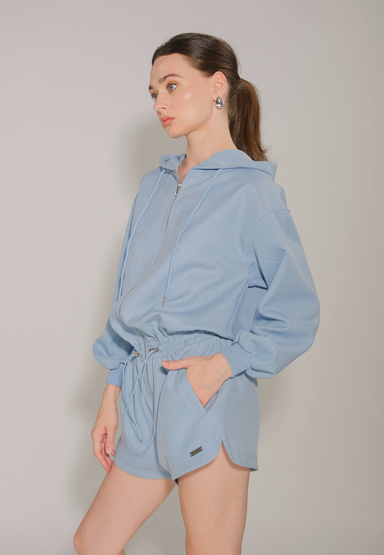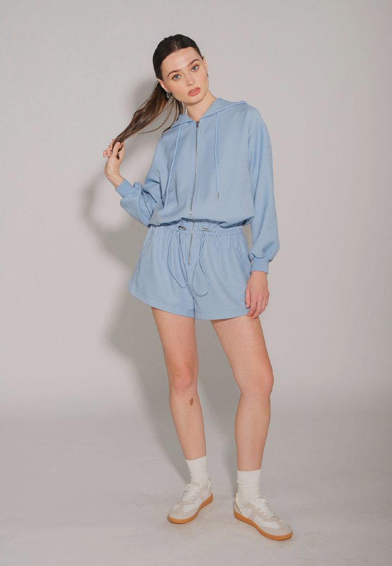 Long sleeve playsuit in textured poly fabric with a relaxed silhouette. Features an adjustable hood with drawstring, front zip opening, side pockets, and a garterized waist with adjustable drawstring for a comfortable fit. Finished with cuffed sleeves and regular-length shorts for an easy, laid-back look.