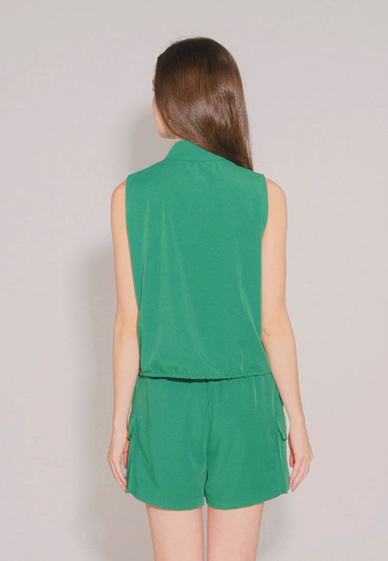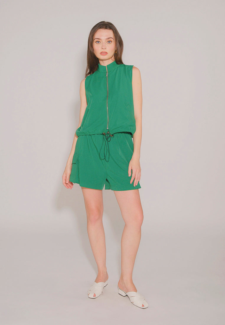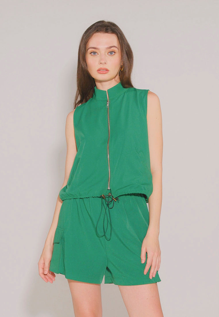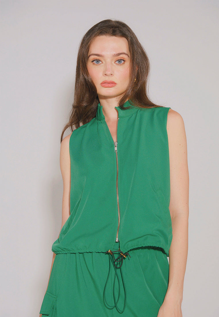 Sporty sleeveless top with a drawstring hem and zip-down closure at the front bodice.