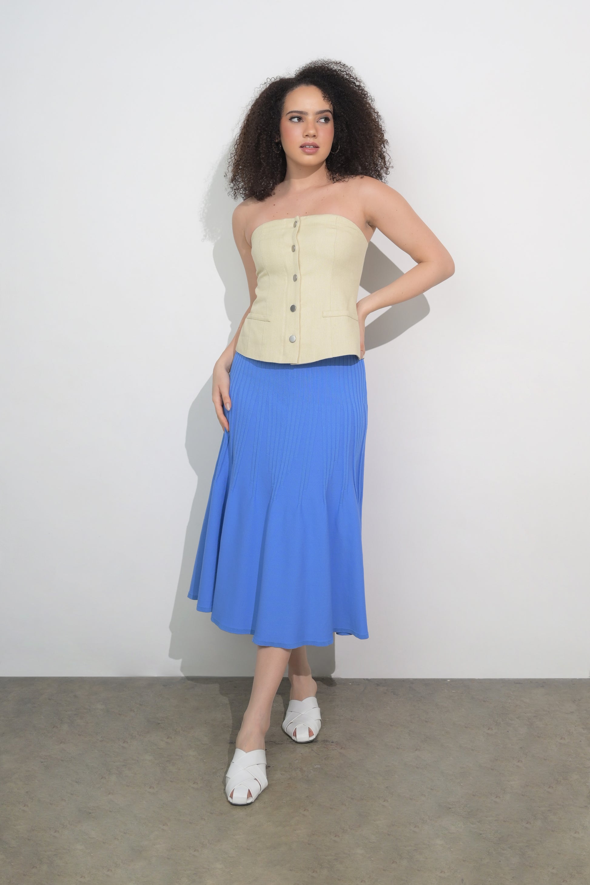 Corset energy with a denim feel. The Fuji Tube top by RAF features a form fitting silhouette with front button closure and a beautiful flared fit down the hem.