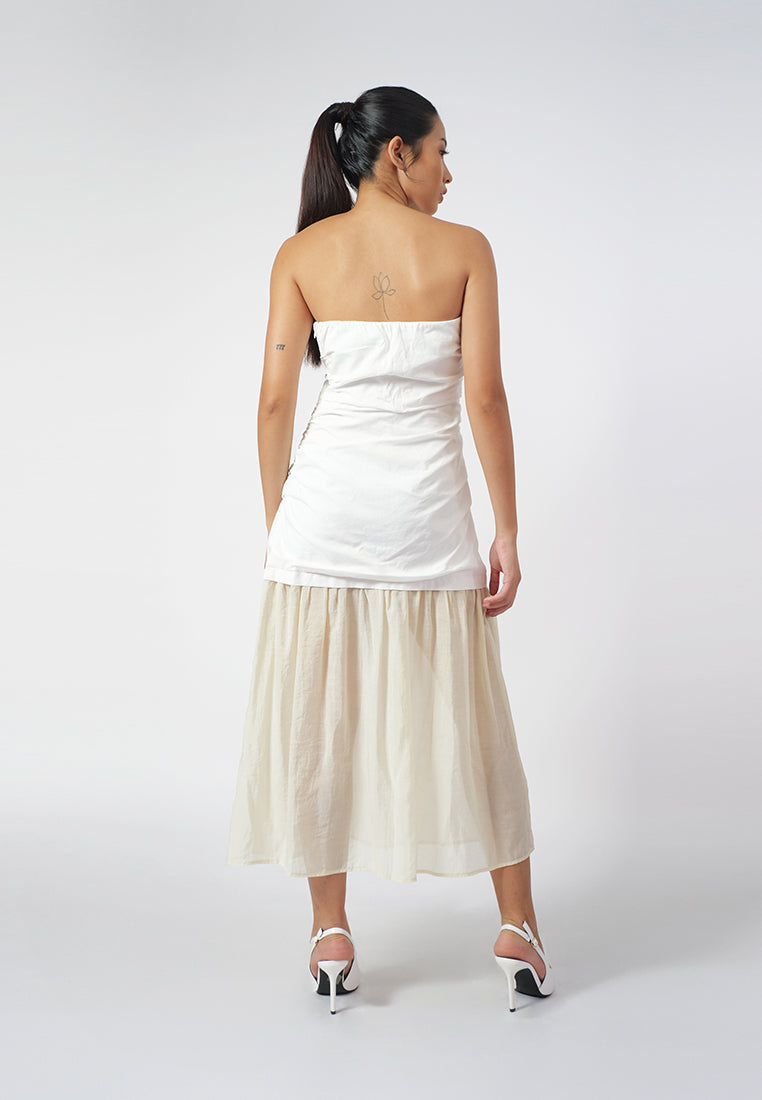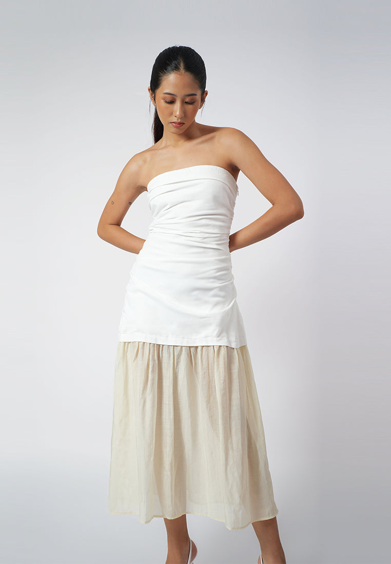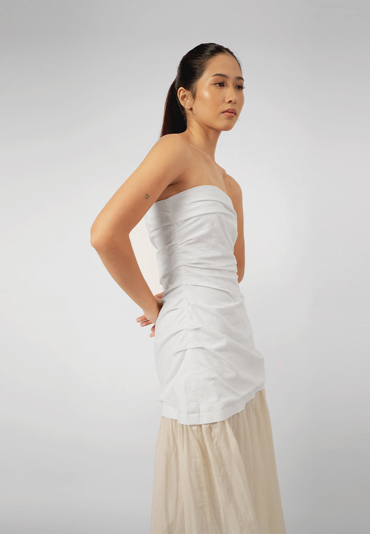 A body-fit dress made in linen and gauze, featuring a tube torso with delicate ruching detail and a sheer skirt combination for a feminine, modern allure. Finished with a side zipper closure for a clean, seamless fit.