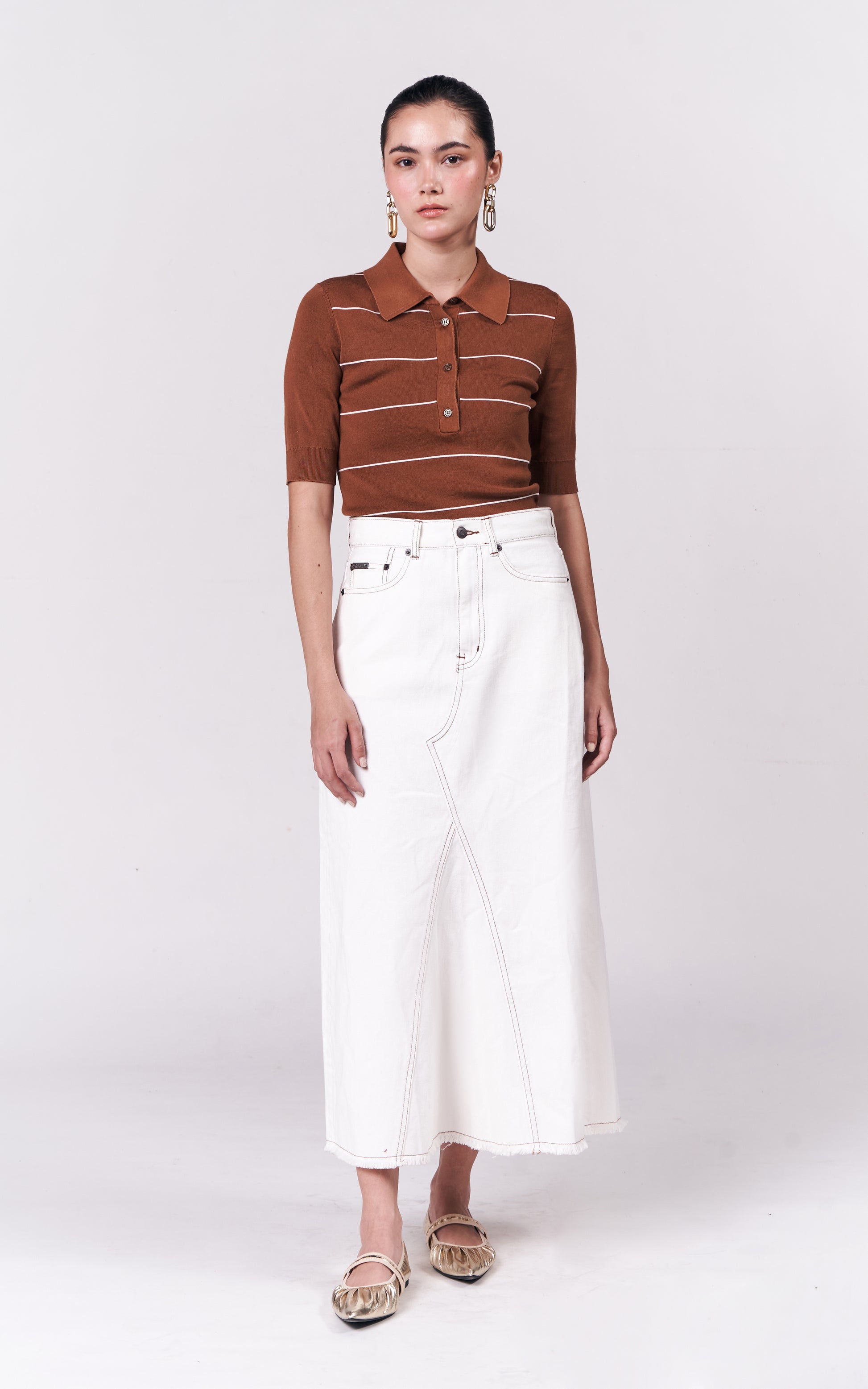 Reimagine the classic denim skirt with the Genoa Skirt. This modern take features topstitched details that create a unique denim pant-inspired design. Stand out from the crowd with this bold and stylish piece.