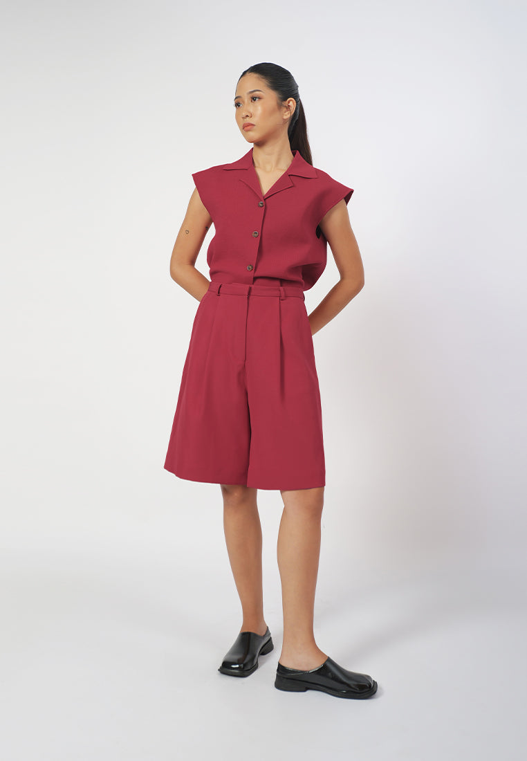 Tailored-fit longline shorts made in soft twill, featuring a high-waisted silhouette with front pleat detailing for a sleek, structured look. Designed with functional side pockets and a front zipper closure, finished at a versatile above-the-knee length.