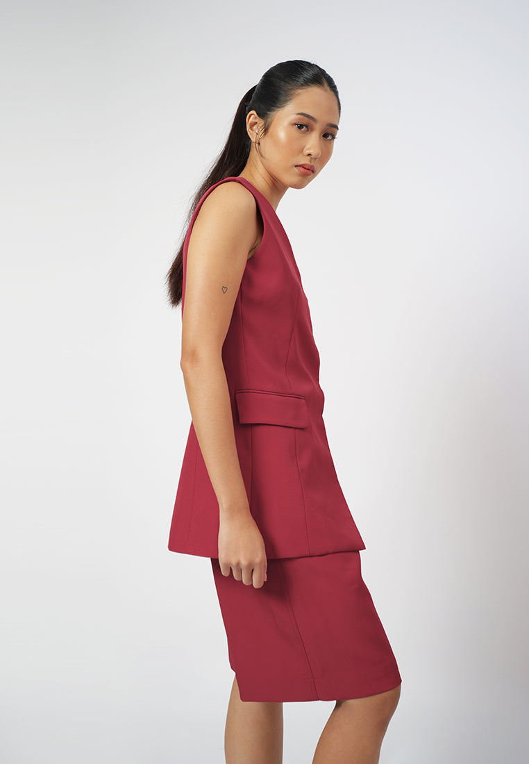 A sleeveless top made in soft twill, featuring a V-neckline with a front hidden button opening for a sleek, tailored look. Designed with two faux side flap pockets and a functional welt pocket on the chest for a refined finish.