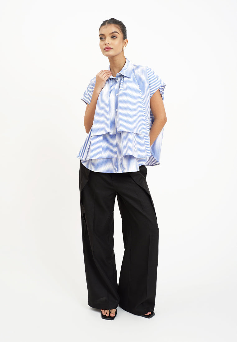 Wide-leg trousers in poly linen, designed with a double waistband and front pleat detail for a refined touch. Features a front zipper opening with belt loops, functional side slit pockets, and faux welt pockets at the back for a clean finish.