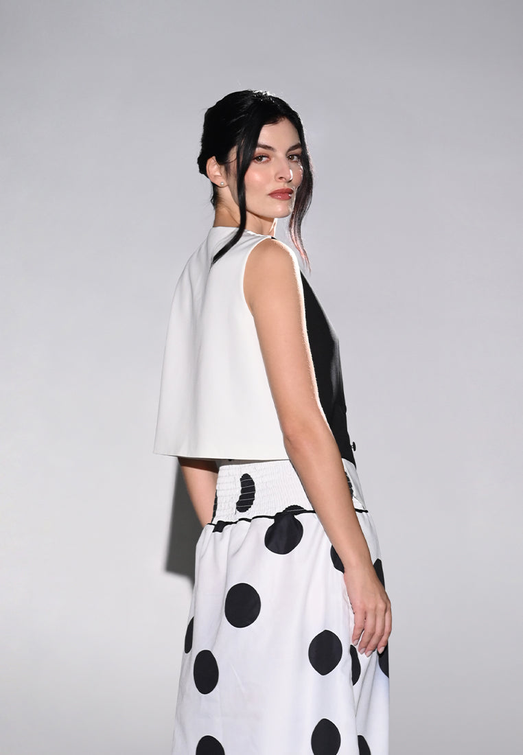 Make a statement with the Heze top. This bold and sophisticated piece features a structured, geometric panel design on a poly crepe fabrication, elevating the classic double-breasted style to new heights.