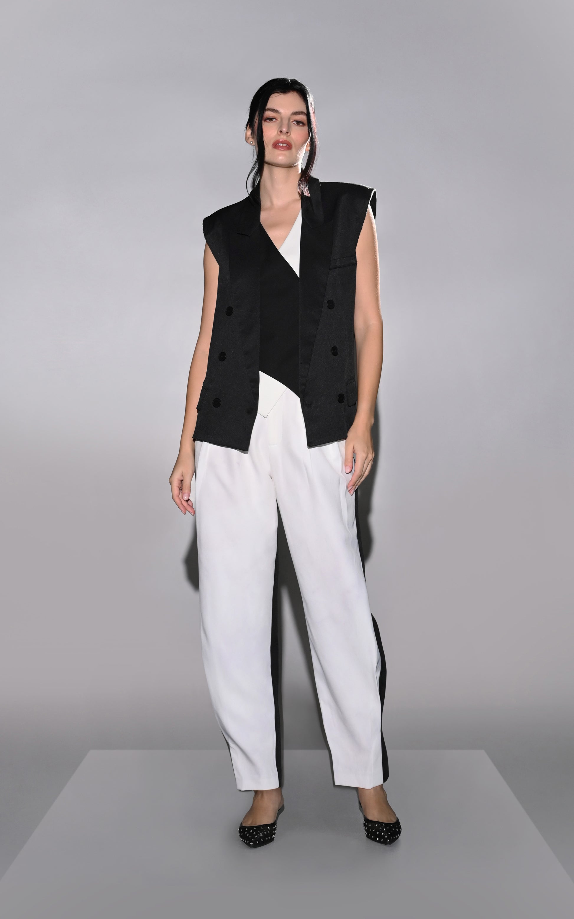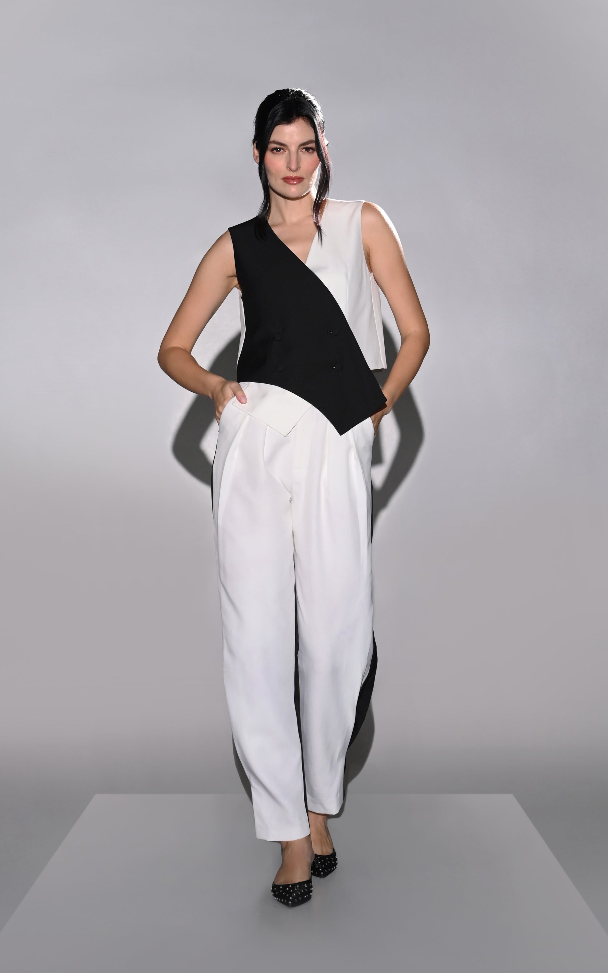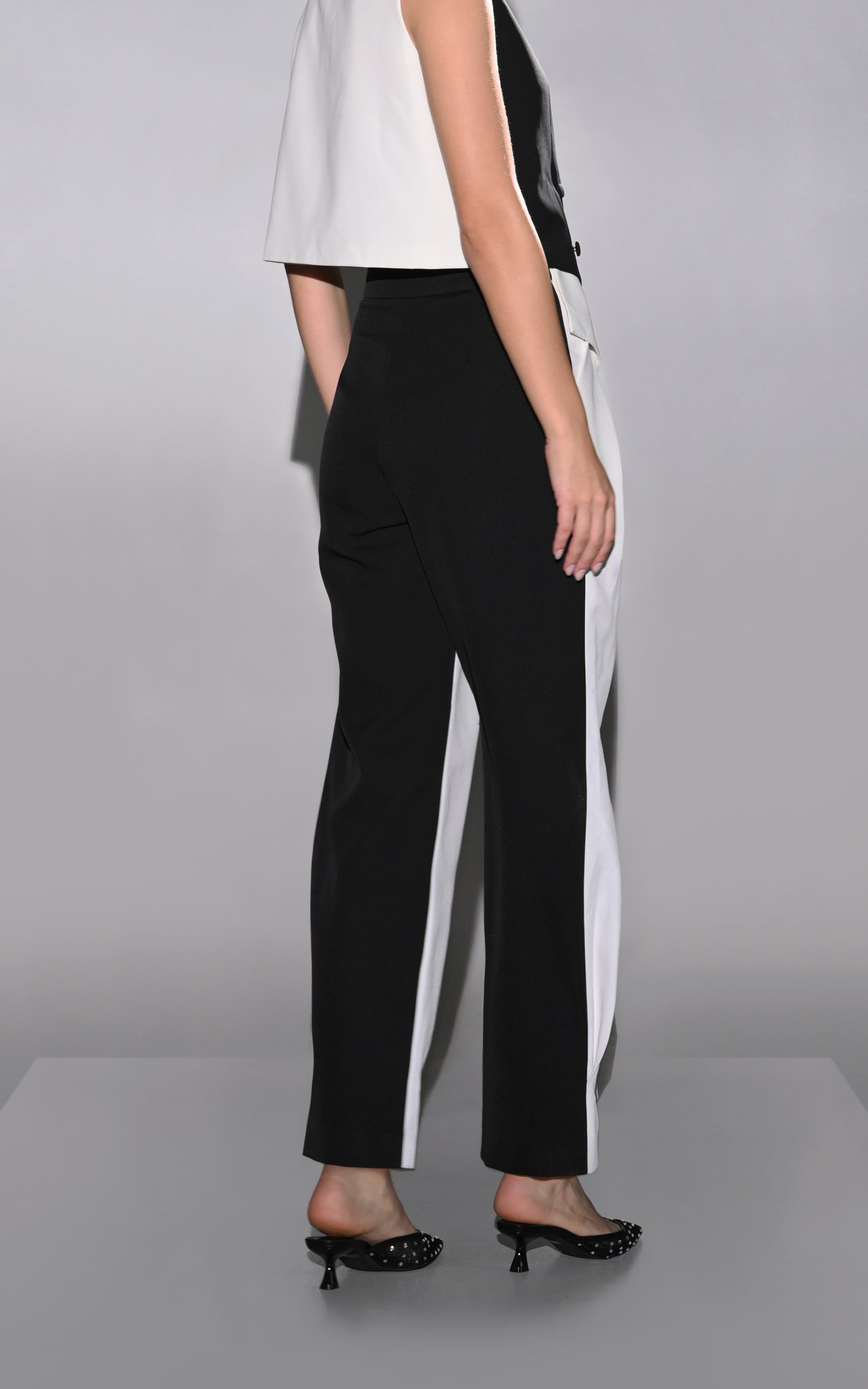 A bold and stylish choice. The Hills pants feature a color-blocked panel design with pleated detailing on one pant leg, creating a flattering silhouette that tapers down to the ankle.