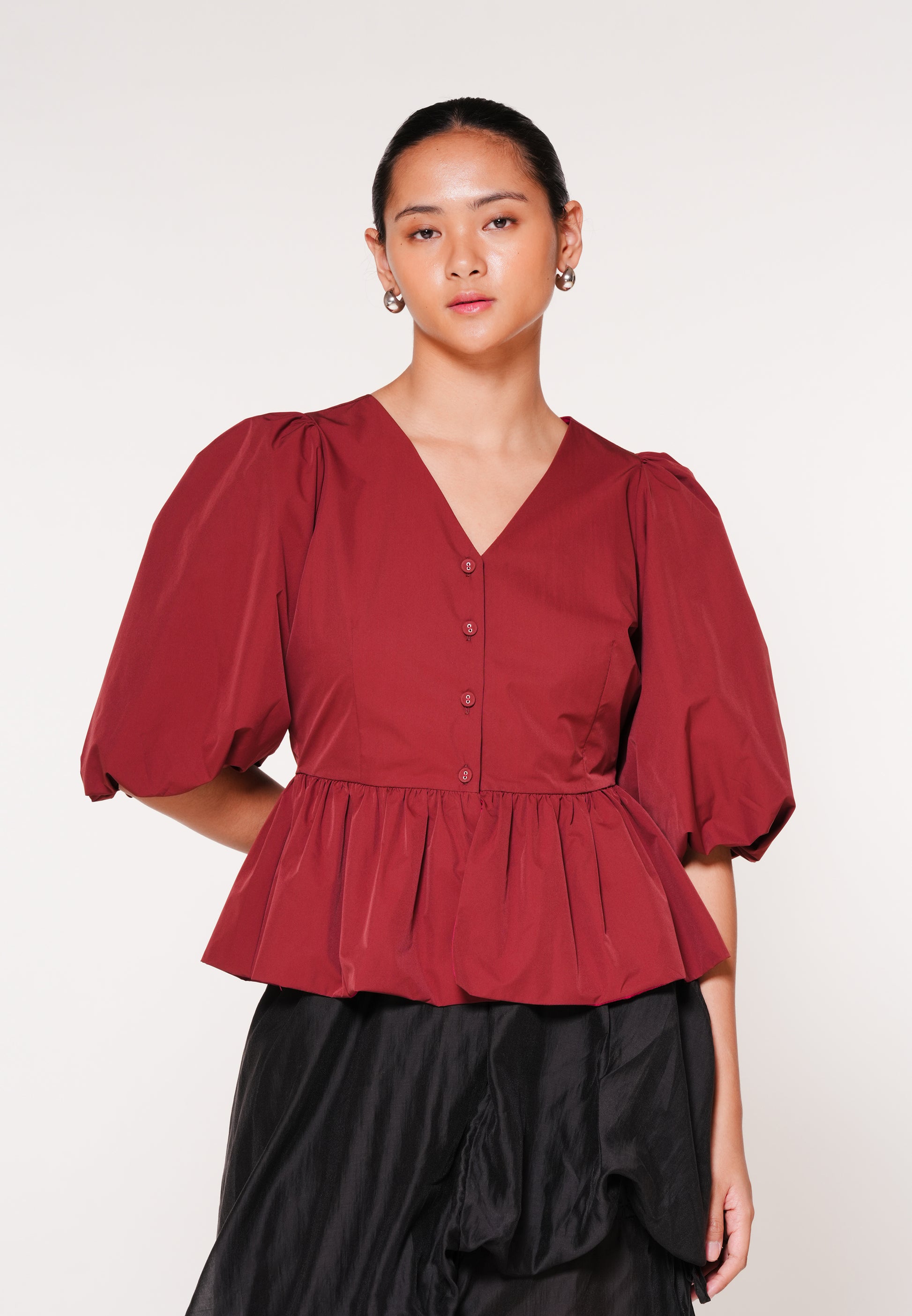Fit-and-flare top made from taffeta, featuring a V-neckline and front hidden placket opening. Designed with bubble lantern sleeves and a peplum cut for a chic, structured silhouette.