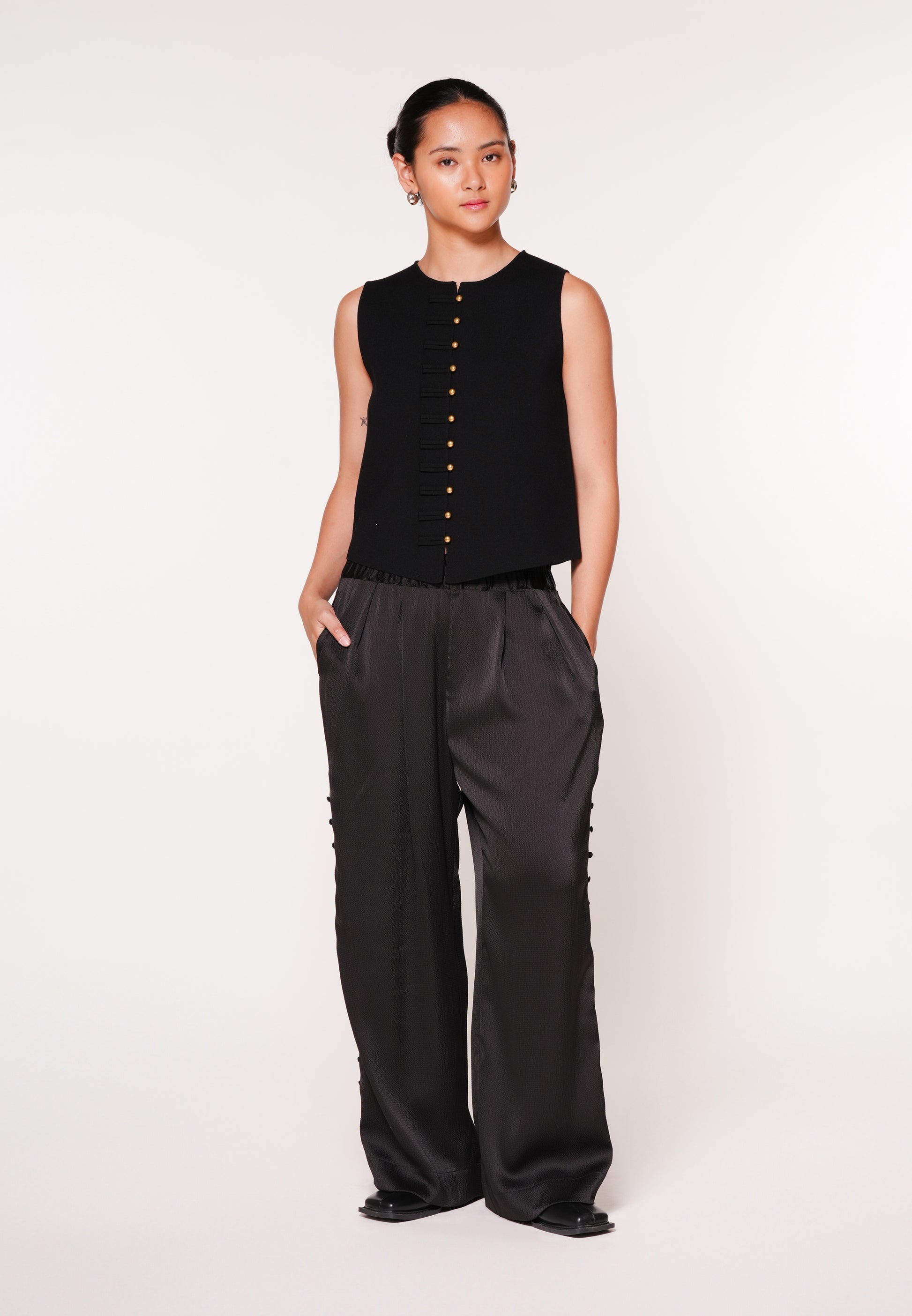 Sleeveless top made from flat knit fabric, featuring a round neckline and a center front opening with metal buttons and button loops. Finished at a standard length for a clean and versatile regular-fit silhouette.