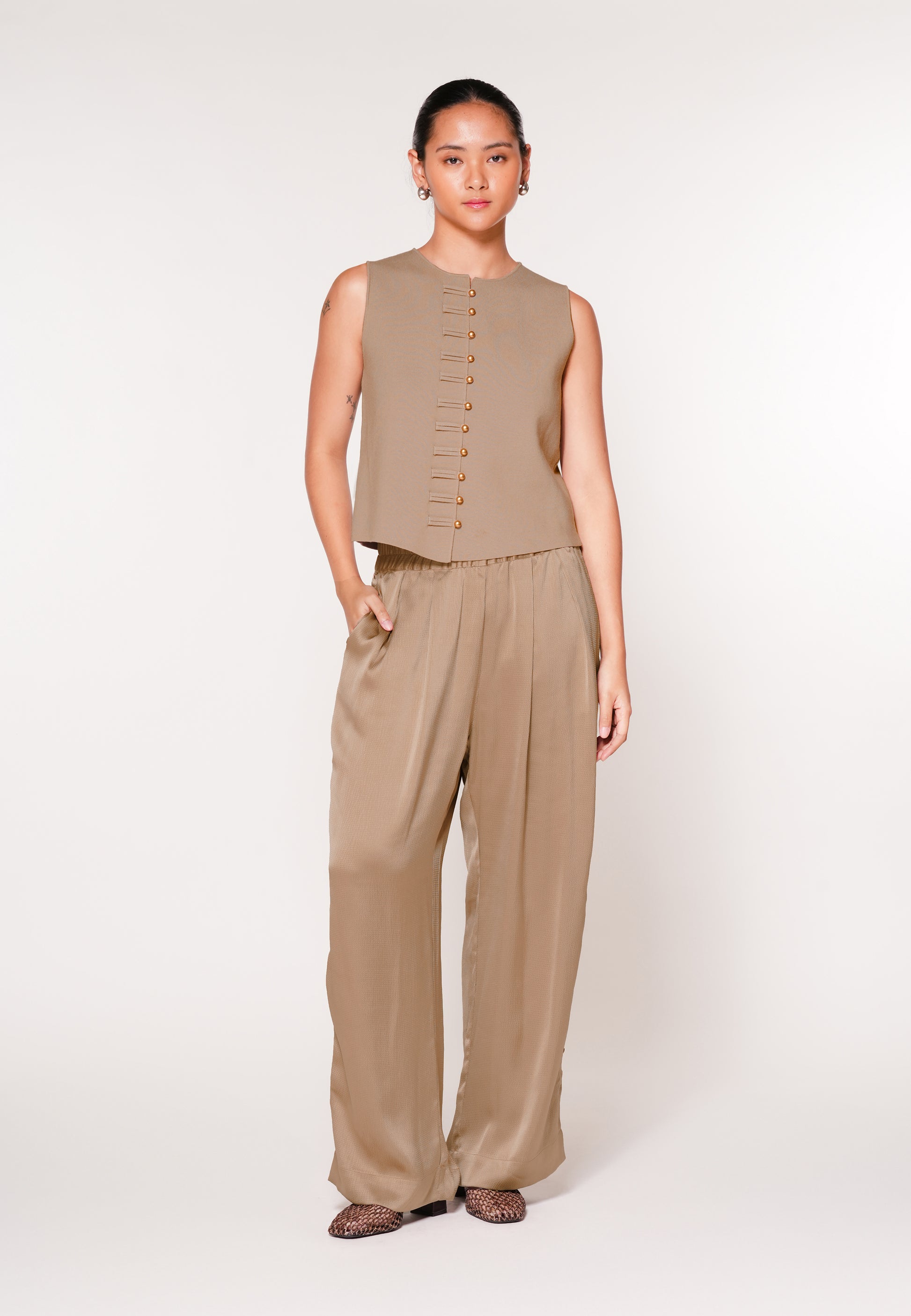 Sleeveless top made from flat knit fabric, featuring a round neckline and a center front opening with metal buttons and button loops. Finished at a standard length for a clean and versatile regular-fit silhouette.