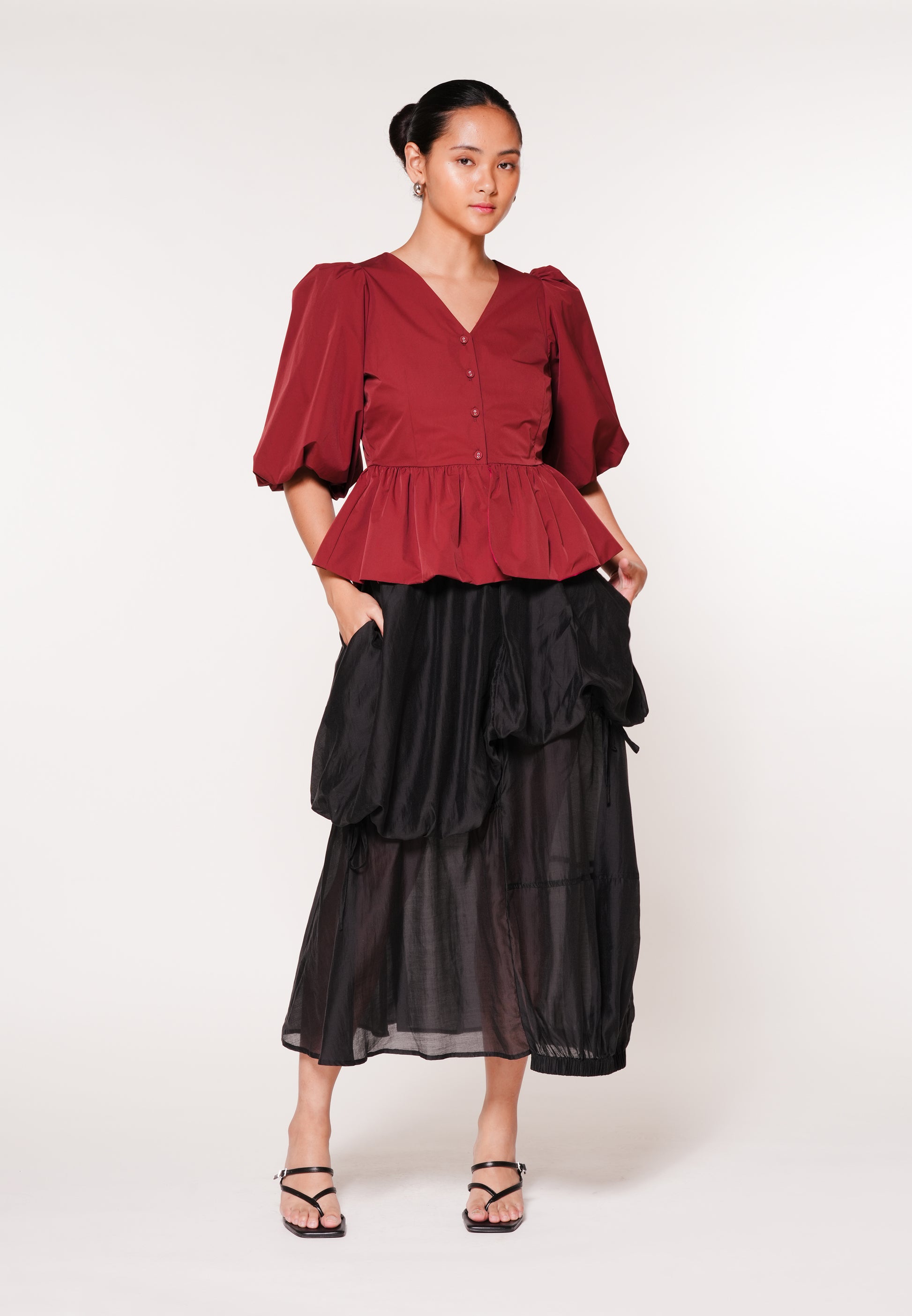 A loose-fit skirt made from soft organza, featuring a hi-waist elastic waistband and bubble detailing with a drawstring for a playful, textured look. Designed with an elastic hem detail on the left side and finished at a midi length for a modern, effortless silhouette.