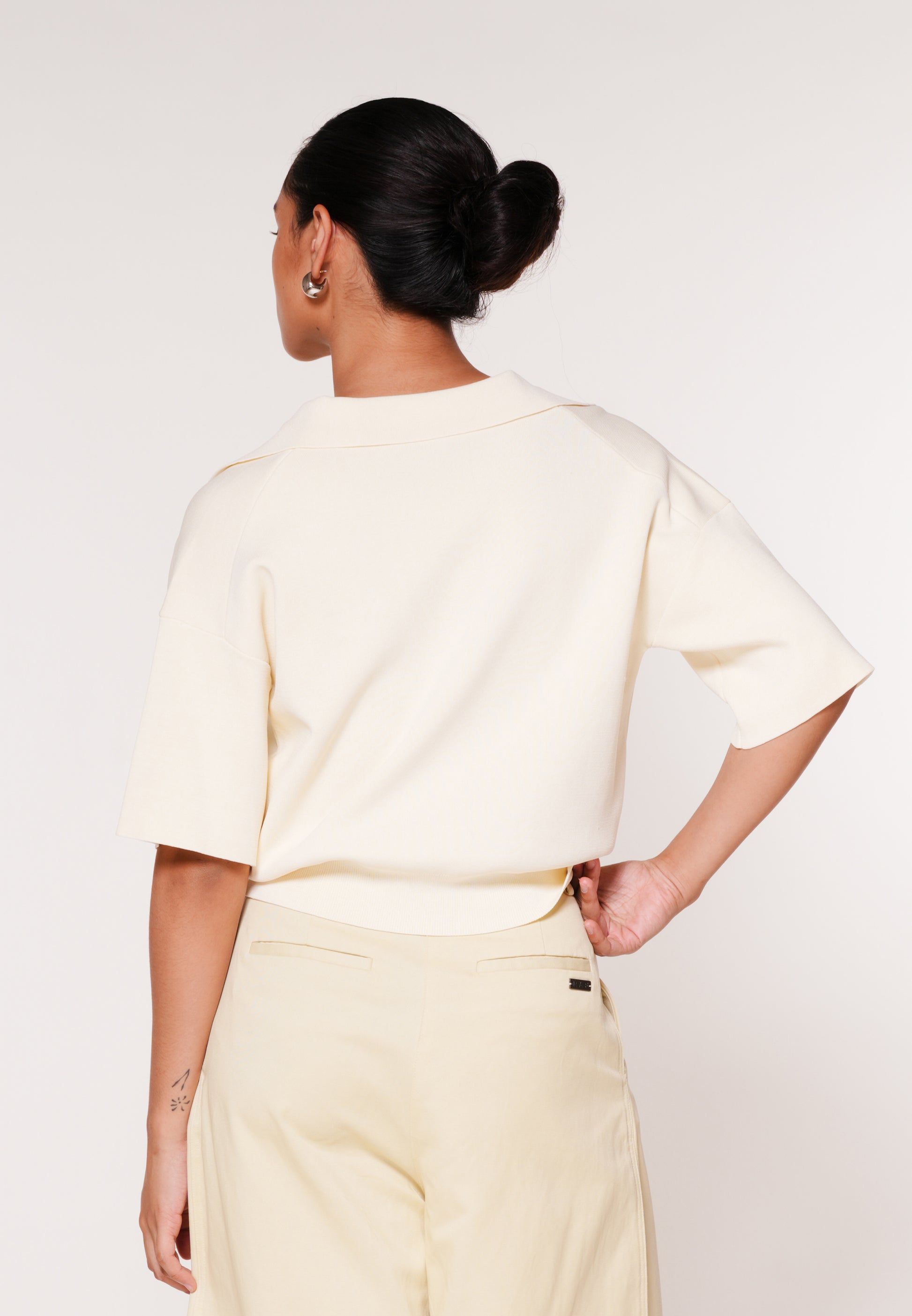 Short-sleeve top made from flat knit fabric, featuring a Johnny V-neck collar and drop shoulder cut for a casual, comfortable style. Designed with a tapered waistband hem and finished at a standard length for an easy, everyday look.