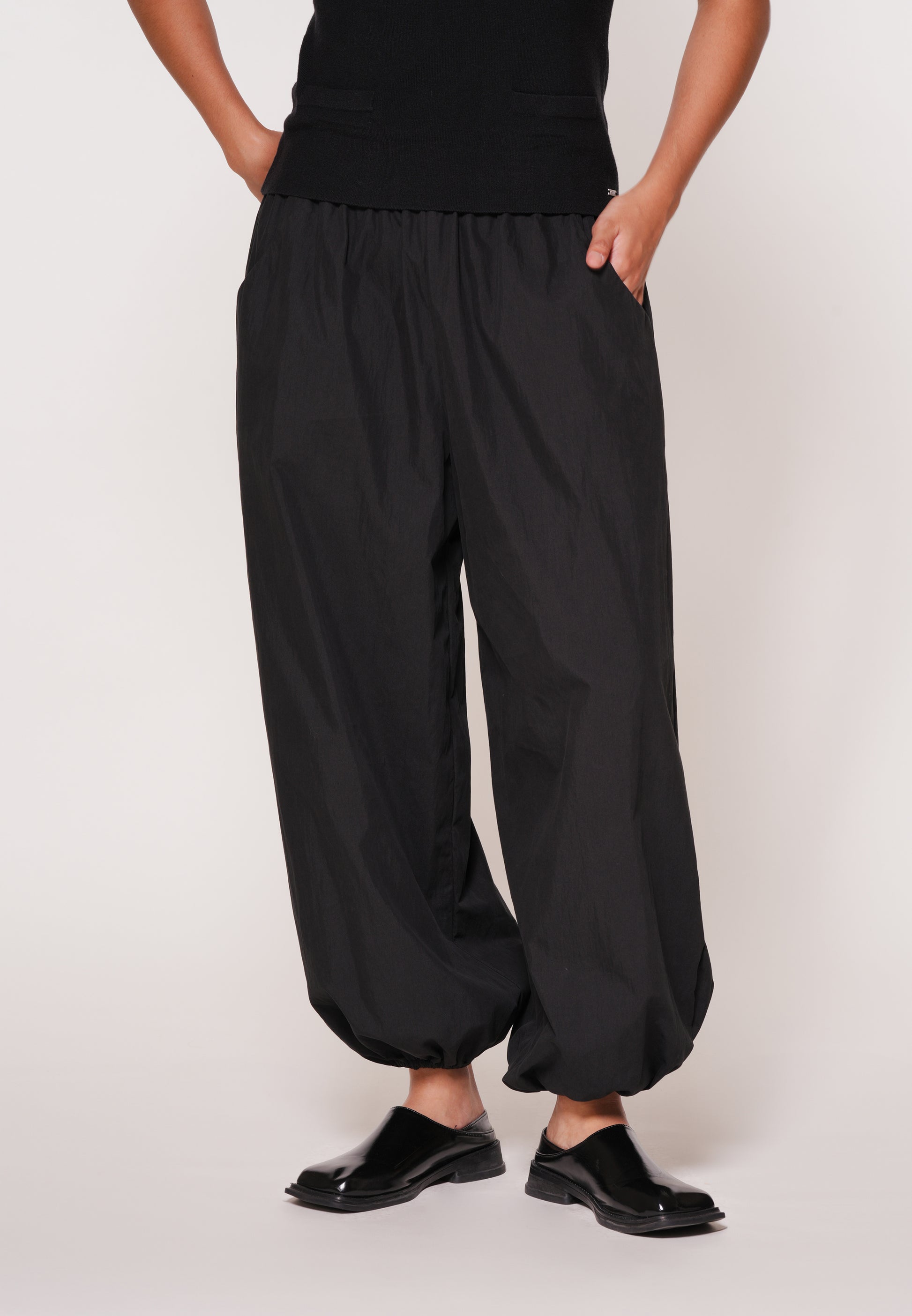 Pants made from cotton woven fabric, designed in a bubble fit for a modern silhouette. Featuring a high-waist elastic waistband and functional side pockets, these bubble hem pants are finished at ankle length for a comfortable and stylish everyday look.
