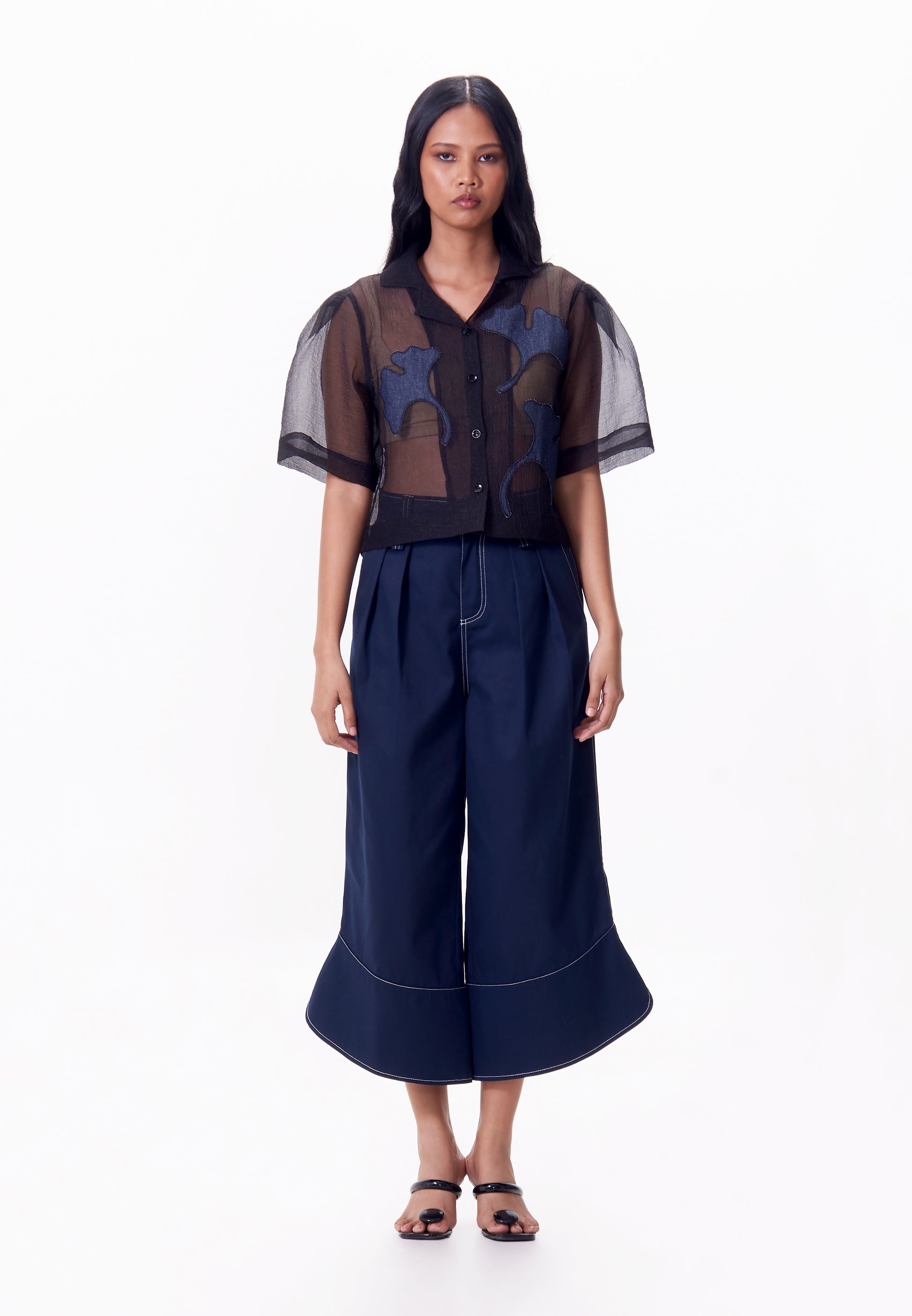 High-waisted wide-leg pants made from twill fabric, featuring a midi length and a front J-shaped zipper closure. Designed with functional side and back pockets and finished with a curved hem cut accented by metal buttons and loops for a structured, contemporary look.