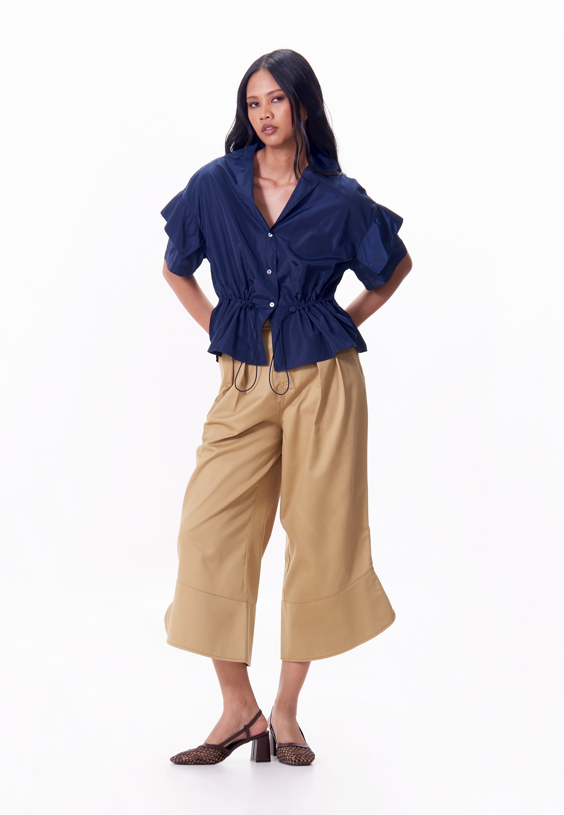 Short-sleeve top made from taffeta fabric, featuring a notch collar with button-down opening and pearl troca buttons. Designed with double-layered sleeves, a waist cut with elastic drawstring and metal stopper, and finished with a tone-on-tone Nicolo embroidery logo at the center back yoke for a polished, contemporary look.