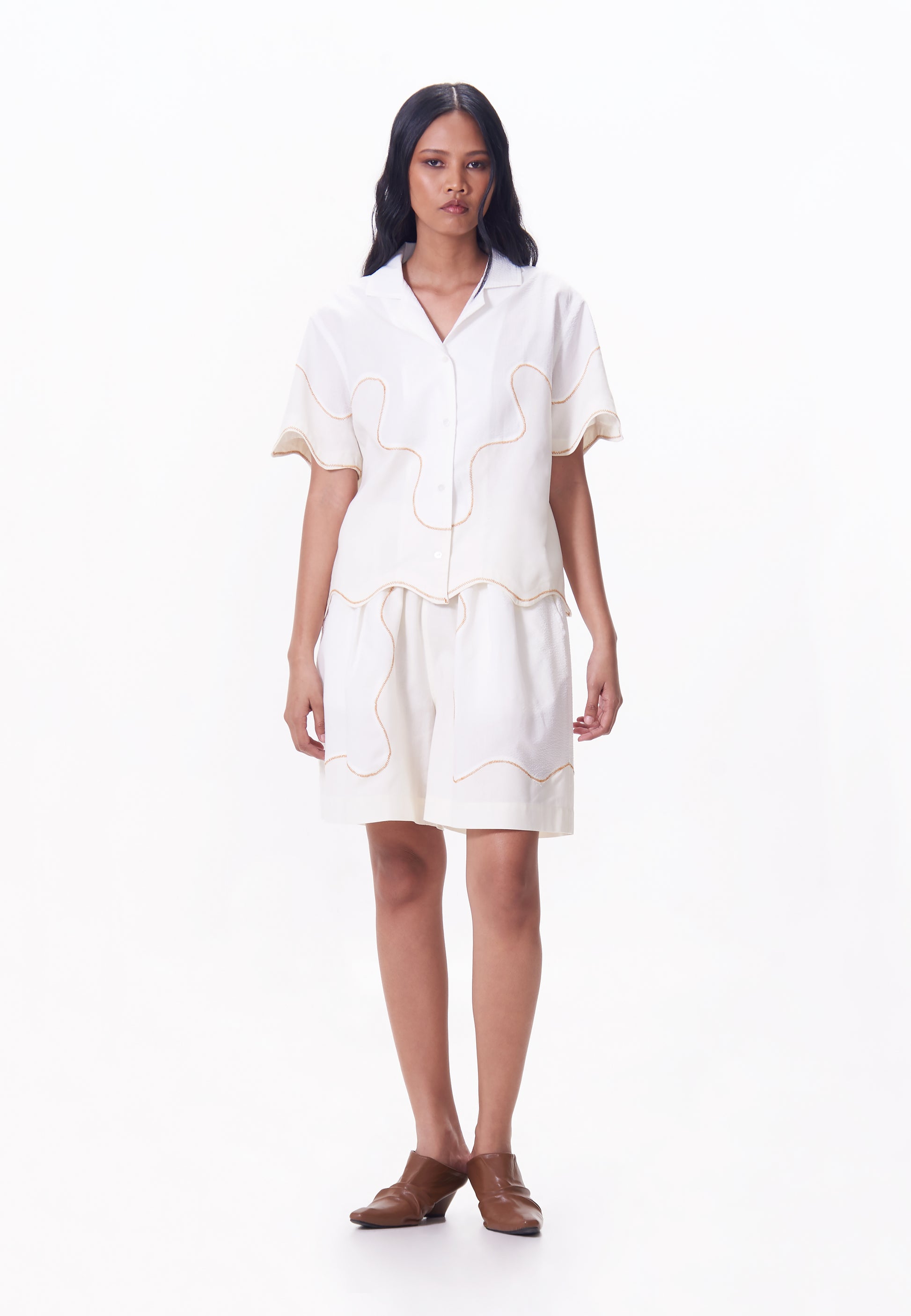 High-waisted boxer shorts made from seersucker and linen, featuring an elastic waistband for comfort and scalloped detailing on the front pockets for a stylish finish.