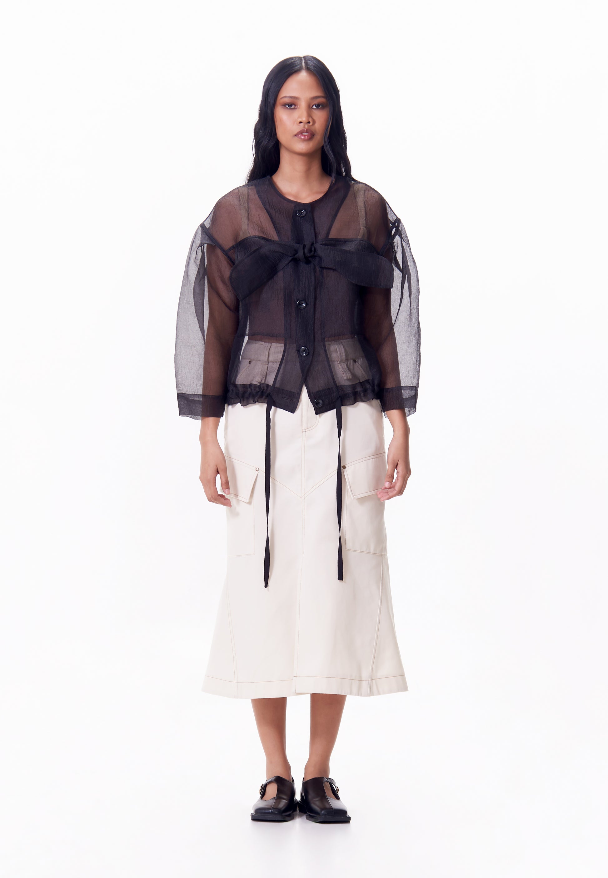 Long-sleeve top made from crumpled organza, featuring a round neckline and button-down front. Designed with a self-tie ribbon on the chest, a drawstring waistband, and drop shoulders with pleated long sleeves for a delicate, airy look.