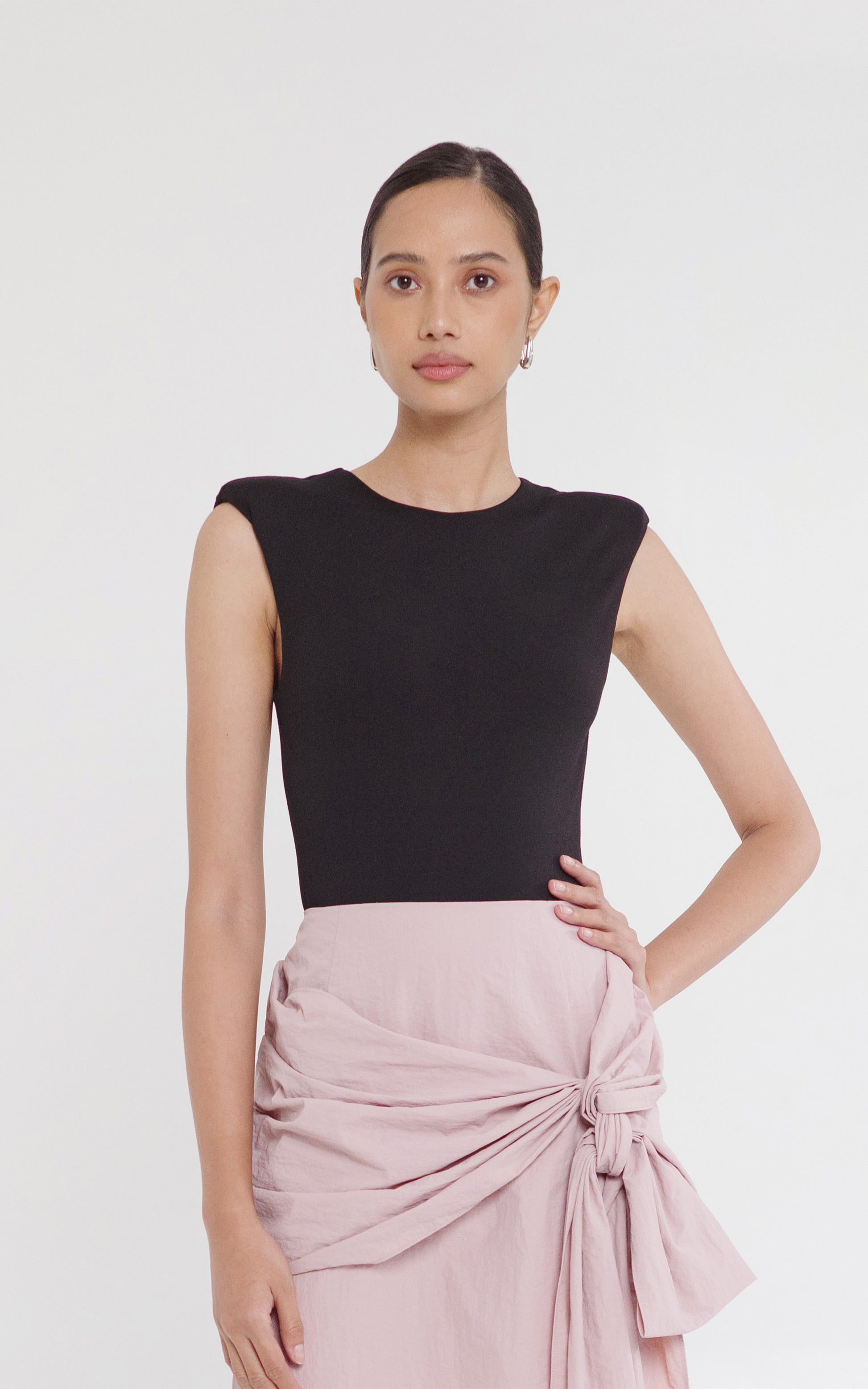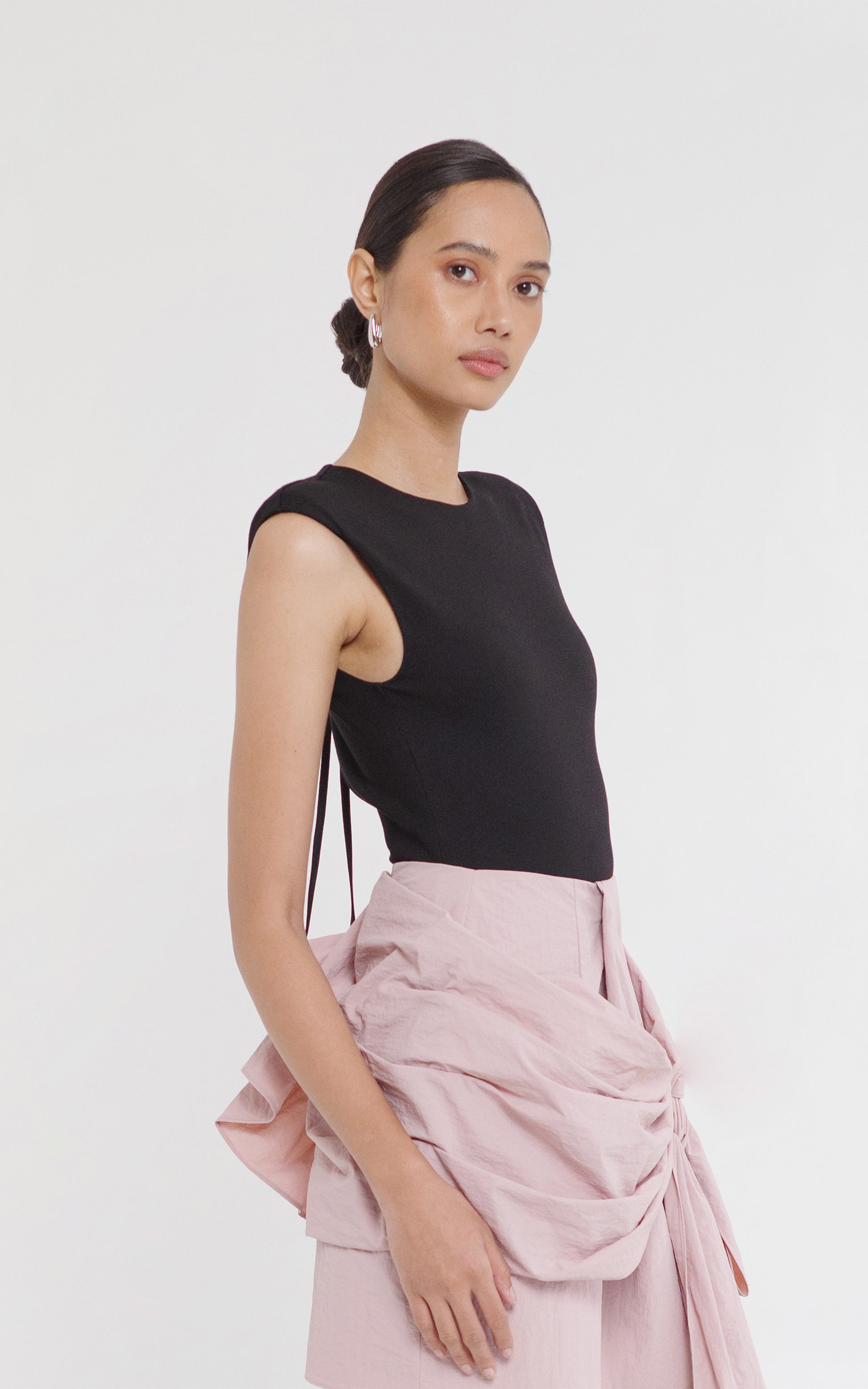 Celebrate your shape. The Anja Bodysuit is all about confident dressing from day to night. Its structured design cinches the waist and extends the shoulders, creating a stunning silhouette. The back opening with ribbon ties adds a touch of intrigue. This Bodysuit is perfect for both casual and formal occasions.