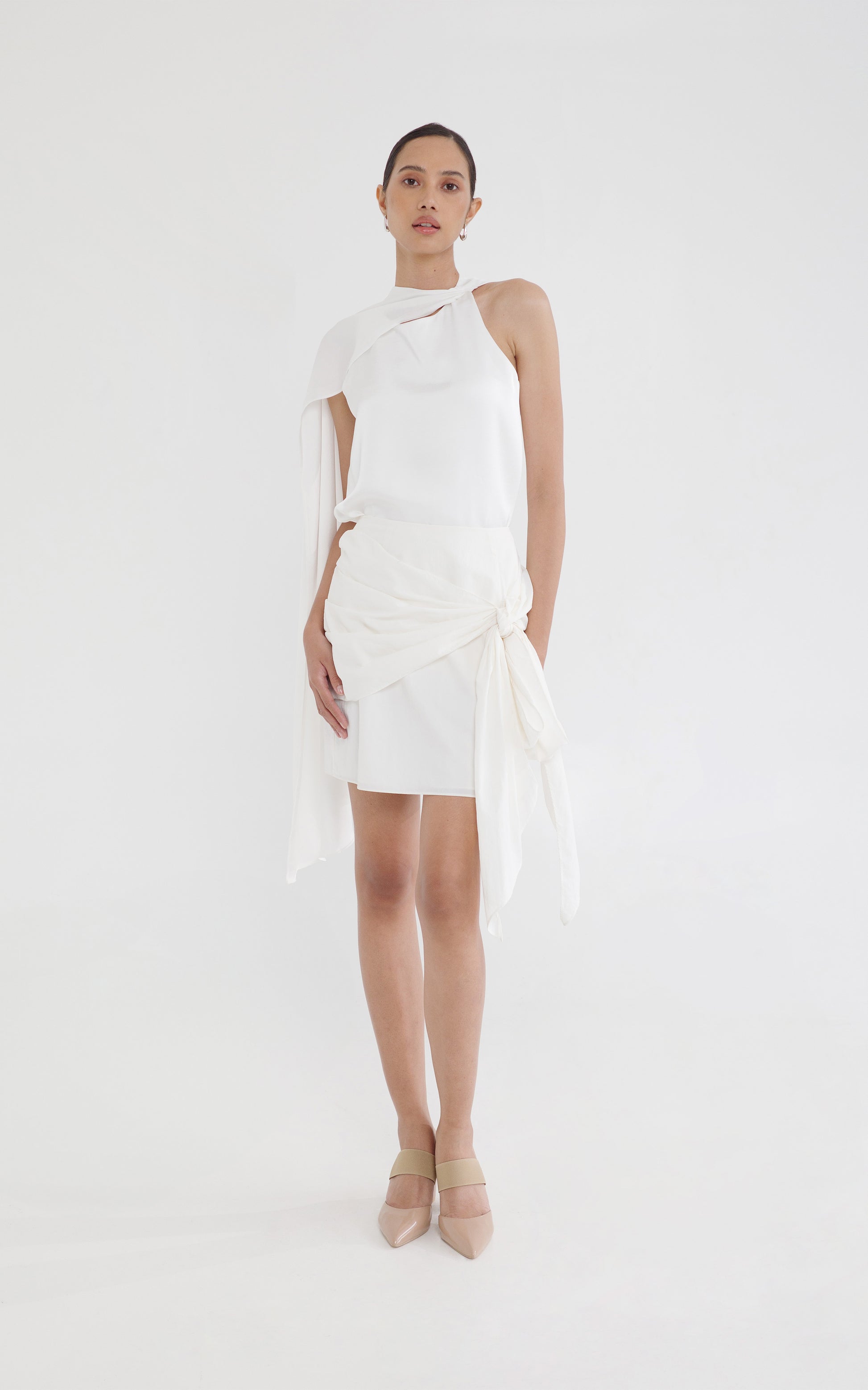 The Bruna skirt is a sophisticated and stylish piece. Crafted from luxurious tafetta, this high-waisted mini skirt features stunning draped detailing and a charming bow accent. It’s a versatile piece that can be dressed up or down.