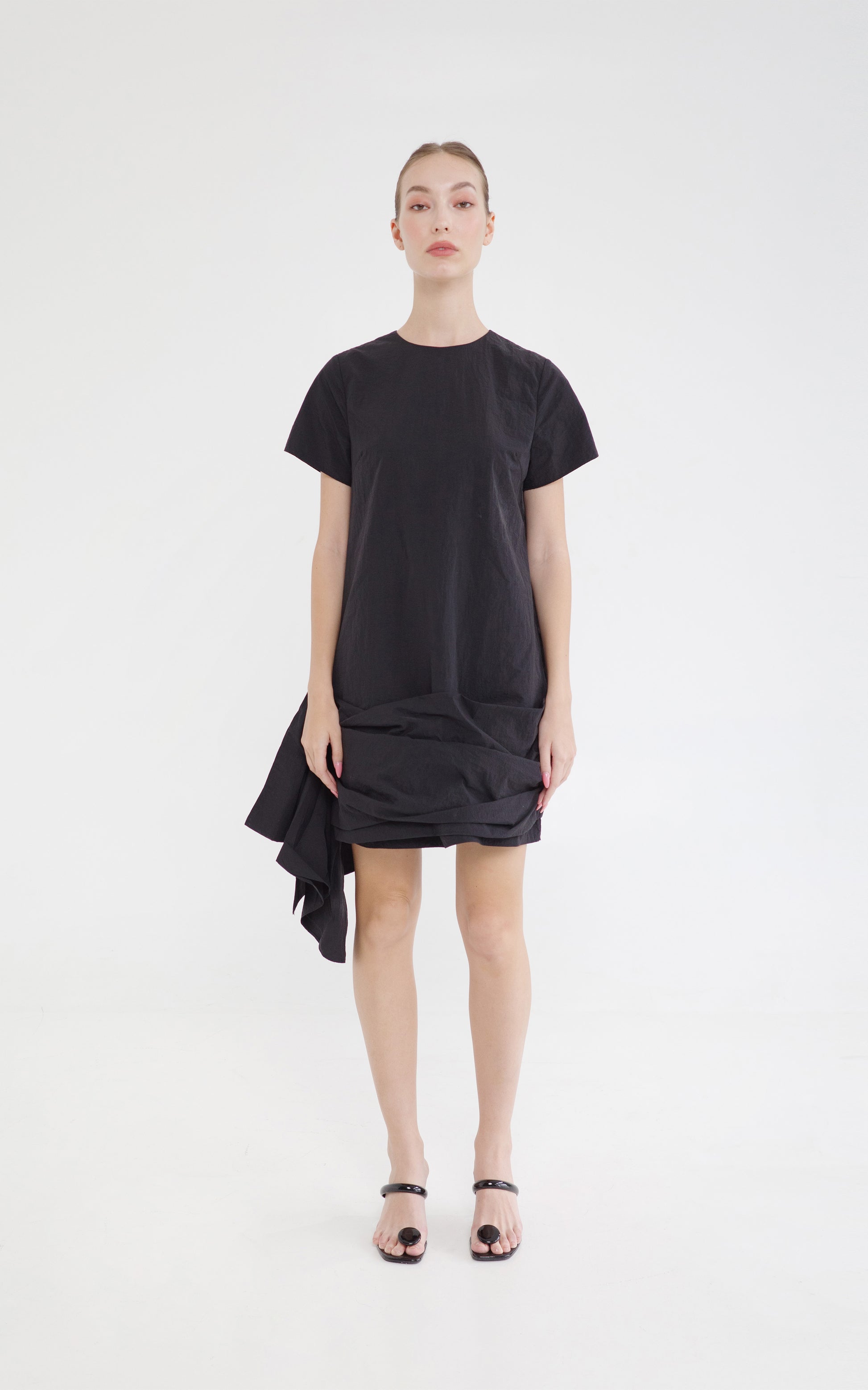 Dreamy and dramatic. The Snejana dress is a perfect blend of minimalist elegance and maximalist flair. Crafted from luxurious tafetta, this classic shift dress features a stunning draped detail that cascades across the hem. The result is a piece that feels both effortless and extraordinary.